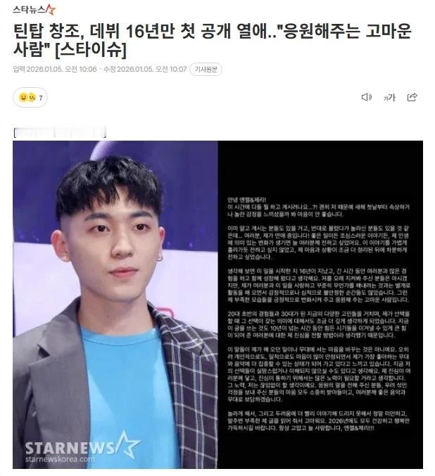【韩国男团TeenTop成员创造突然官宣恋情】海外新鲜事热点现场 本月4日,韩国男子组合Teen Top成员创造(本名崔钟显)通过个人社交媒体官宣恋情。创造表示:“可能有些人已经知道了,也可能有些人还不知道并感到惊讶,我正在恋爱中”、“无论是喜事还是需要谨慎对待的事,只要我人生中有意义的变化,我都想告诉大家。我不想轻描淡写地传达这件事,而是希望在自己整理好心情和状况后,再平静地告知大家”。创造还表达了对女友的特殊感情:“在活动期间我也有很多情绪上和心理上不稳定的时刻,她是一个让我积极改变自己的不足、并给予我支持的值得感谢的人。”最后,创造表示:“让大家感到惊讶,并且因为我的担忧而没能更早告诉大家,对此我真的感到抱歉。也感谢大家阅读我这些词不达意的文字,祝愿大家在2026年也充满健康与幸福。”出生于1995年、今年32岁的创造于2010年7月作为Teen Top成员出道。随后于2023年11月以陆军现役身份入伍,并于去年5月期满退伍。