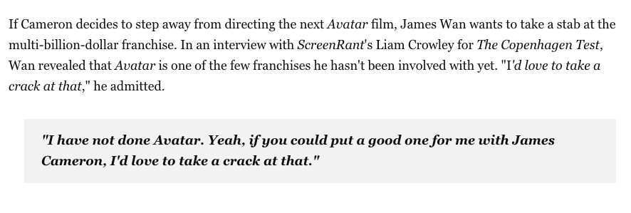TNABO 温子仁发话,表示如果詹姆斯·卡梅隆真的不拍《阿凡达4》,他乐意出力帮他拍下去“是的,如果有机会的话——要是能有詹姆斯·卡梅隆背书,我会非常愿意试一试。”