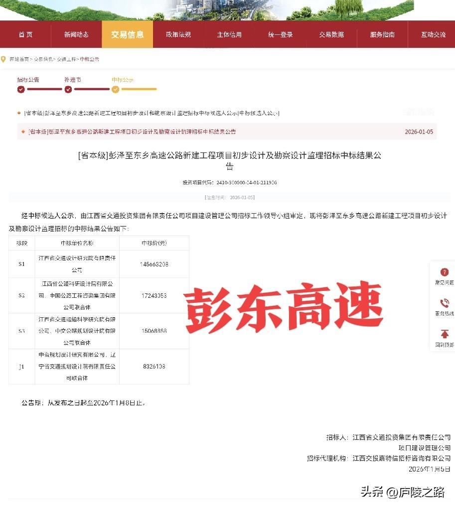 彭泽至东乡高速公路新建工程项目初步设计及勘察设计监理招标中标结果公告
