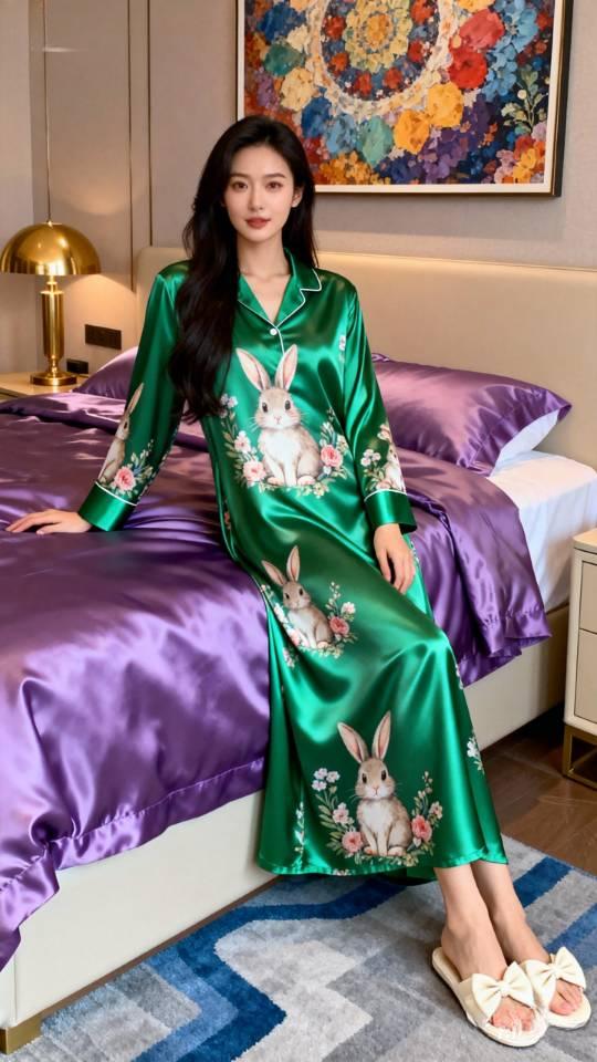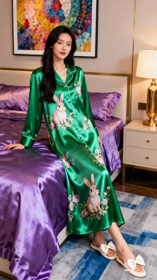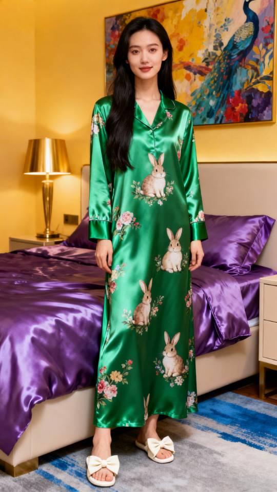 美女展示真丝缎绿色兔子家居服。家居服晨袍