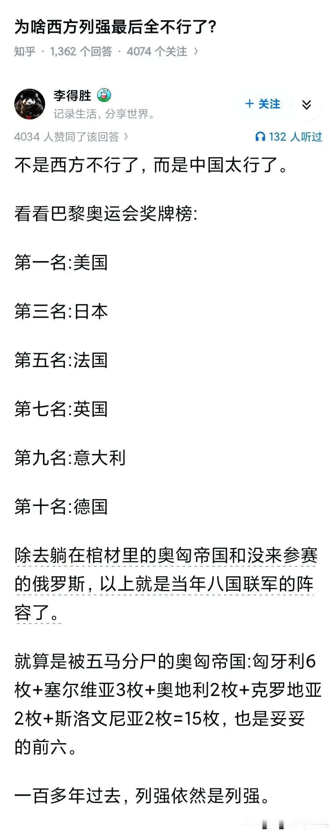 西方国家并没有不行了! 巴黎奥运会4*100米男子游泳决赛,除了中国队以外,清一色欧美国家白人的六支队伍,结果就是肤色更白的中国队夺冠,一举打破美国霸占40多年的王者宝座。这里面的不容易,可想而知。 事实证明如果没有咱们中国队的强势逆袭超车,世界还是曾经的世界,几乎不可能有任何变化。以前的列强,还是现在的列强。 不同的是,中国却在二战以后,强势逆袭崛起,一直冲到世界第二的位置。这个时候才发现,只有中国能给世界人民带来希望。 也许那些发展中国家,都会以中国崛起的例子来激励自己,但是想学习中国却很困难。其中印度发展的不错,但是印度的现状,大家都了解。 西方世界编织的大网,将发展中国家罩住,无法更进一步。只有咱们突破了重围,取得成功。不仅仅是经济突破,体育也突破了重围,成功跻身世界三甲水准。 这个世界上,自己不努力,没有谁会去帮忙,而是要全力以赴,才能赢得世界尊重。赶超并不容易,全力以赴才有希望成功。