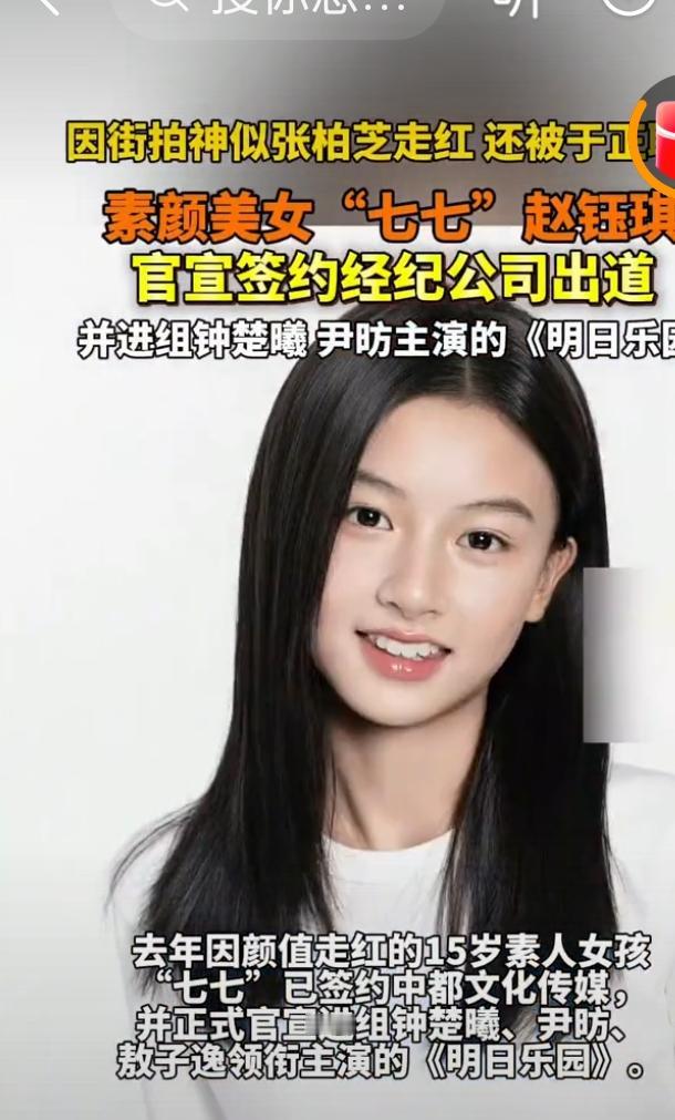 神似张柏芝的素颜美女七七正式出道 2026 年 1 月 5 日,曾因素颜街拍火爆网络的 15 岁女孩七七(本名赵钰琪)正式官宣出道。签约中都文化传媒后,她立刻进组科幻冒险剧《明日乐园》,与钟楚曦、尹昉等实力派演员携手合作,迅速完成了从素人到演员的华丽转身。 故事要从 2025 年 7 月的一段街头视频说起。在河南南阳的街头,未化妆容的七七眉眼舒展,骨相绝佳,那清冷纯净的气质让网友们惊叹“神似年轻时的张柏芝”。相关视频累计点赞超 24 万,她也由此获得了“柏芝分芝”的昵称。 对比两人的颜值,相似的下颌线、挺拔的鼻梁和英气的眉眼,让她们的侧颜相似度高达 80%。不过七七更多了几分恬静柔和,宛如带露的栀子花般清新,不同于张柏芝当年带刺玫瑰般的灵动倔强。 走红之后,包括于正团队在内的多家头部 MCN 与影视公司纷纷抛出橄榄枝。于正更是公开索要联系方式,却被七七妈妈以“优先完成学业”委婉拒绝。 半年时间里,七七没有急于将热度变现,而是系统地接受表演与形体训练,还通过 vlog 分享成长日常。这份沉稳让网友对她好感大增。 官宣出道后,七七的艺人公式照与进组动态引发了热烈讨论。 支持者直言“内娱终于有纯天然青春脸了”,十分期待她在末世题材剧中的表现;也有网友理性地指出,撞脸只是敲门砖,非科班出身的她需要用作品来打破“脸替”的标签。 值得一提的是,《明日乐园》作为热门 IP 改编剧,由许宏宇监制,七七以特邀演员的身份出演贴合其青春特质的角色,由此可见公司对她的重视。 从素人街拍红人到正式演员,15 岁的七七站在了流量与实力的十字路口。 撞脸张柏芝让她赢在了起跑线上,但娱乐圈从来不缺高颜值的新人。 未来,她唯有在表演中沉淀自我,打造属于自己的个人标签,才能在竞争激烈的内娱长久发展。 这场青春与星光的邂逅,究竟是昙花一现还是长期发展的开端,不妨交给时间和作品来给出答案。