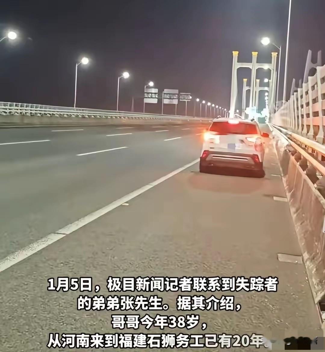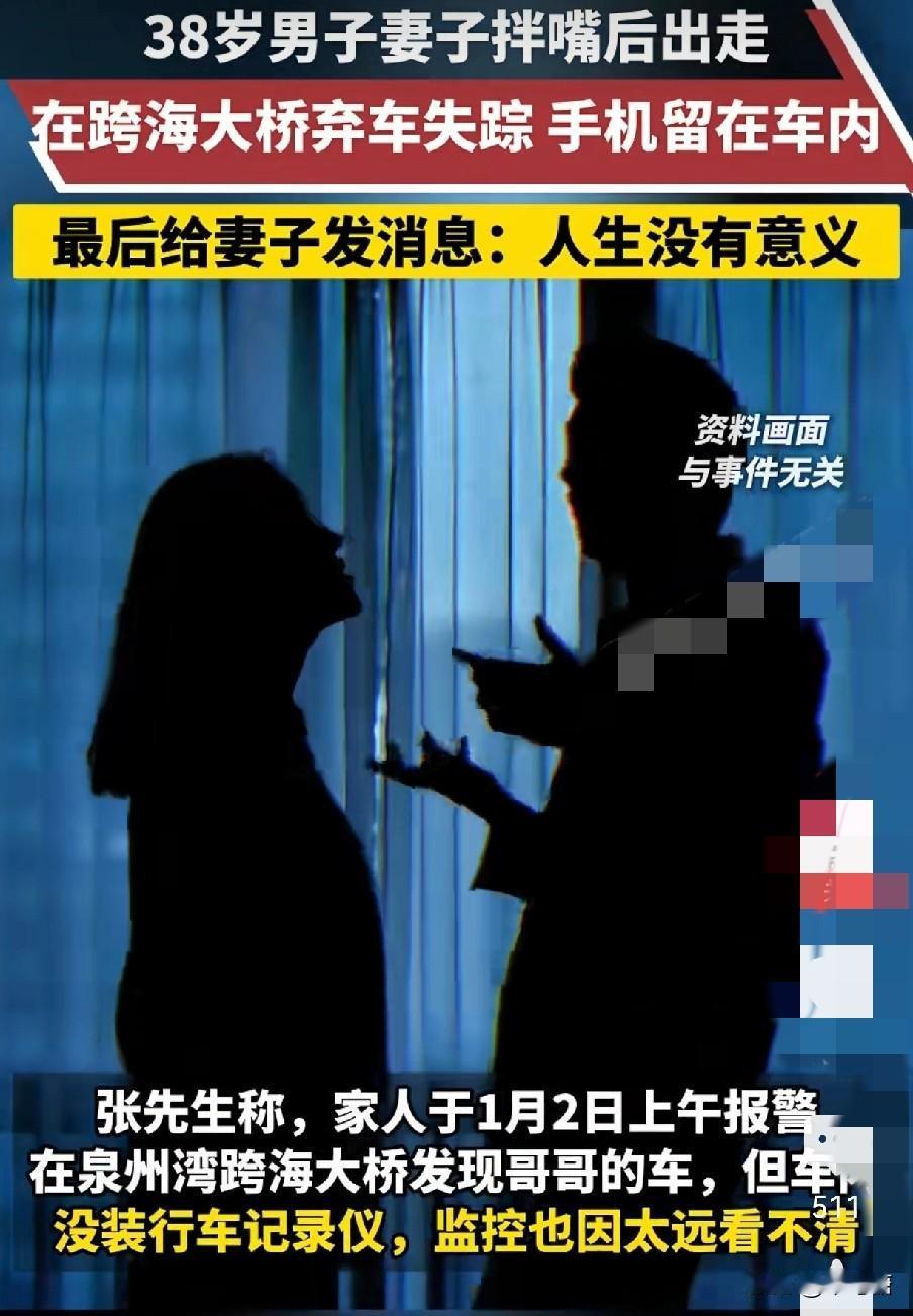 真的只是因为妻子嫌弃丈夫不洗脚,而产生的“人生没有意义”了吗?往往压垮一个人的意志,从来不是在外的受苦受累,反而是身边最亲的人一句无关痛痒的话。 1月1日,福建泉州就这么消失了一个男人,留下了一辆打着双闪的车,留下一部给妻子发去最后一条消息的手机,就这么失踪在一座大桥上。 那天的他,去了朋友家小聚,回来晚了,妻子一句再平常不过的抱怨,“洗脚了吗?”或许是酒精的微醺,或许是积压的情绪无处宣泄,丈夫就这么离开了家。妻子当时并未多想,只当他是一时赌气,想出去冷静片刻,却未曾料到这一别竟成了失联的开端。 所有的亲人都赶来寻找他,搜救队,无人机,截止到今天还是没有消息,众多网友都祈祷,但愿只是个赌气的男人,一时想要寻找一个独处的避风港,两个孩子在等待父亲的归来,妻子也深感后悔,早知道这样,你一辈子不洗脚也不抱怨了。这场因“洗脚”而起的争执,说到底,不过是婚姻里无数琐碎矛盾的一个缩影。 如果你曾在事发时段途经泉州湾跨海大桥,见过相关线索,恳请及时与警方或家属联系,让我们一同为这个家庭点亮回家的希望。最后想问问大家:你觉得婚姻里,最伤人的是大吵大闹,还是那些随口而出的嫌弃和抱怨? (图片来自网络视频)