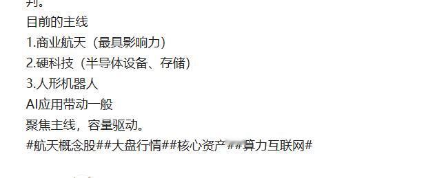 选好核心资产,静待花开 12月14号,选中了3个方向6个标的,这就是接下来的目标 自己选了2个,中途把中测换到烽火,现在来看多此一举。 其余几个这短时间都有大涨,今日集中爆发。最好的肯定是我买的那两个。 安心拿,空间是非常可观的。50步以上都是降低预期的。 今日光通信走弱,烽火也跌了,但没走,第一次分化,早盘有高抛自然不错, 但我发现对比卫星、卫通、北斗,这个就是杂毛,以后大家也要注意,怼龙头就可以了。 这个阶段,找好核心股,等个好低点安心拿就可以了。 这就是为啥我把这个阶段定义为核心股显著上涨的阶段 刚启动不入,那后续只能显著提高价格了。 目前不关心指数,机会远大于风险,关键在于行业 现在和之前不一样了 以前大盘涨,80%个股涨,大盘跌80%跌 现在变了,普涨反而都涨,但赚钱效应一般 局部爆火的赚钱效应往往并不是普涨的时候。 记住,未来增量的核心股。 当下的主线依然是这几个 1.行业航天,(这波的绝对主线) 2.半导体设备(国产替代的先头羊,存储也行,但半导体设备是主升) 3.人形机器人,很多个股的相当于在“底部”,未来潜力大。