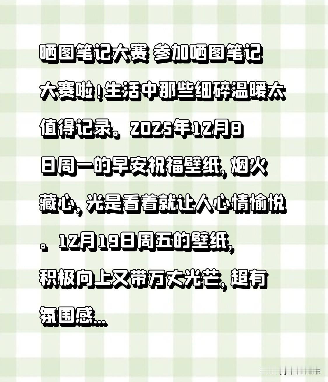 晒图笔记大赛 参加晒图笔记大赛啦!生活中那些细碎温暖太值得记录。2025年12月8日周一的早安祝福壁纸,烟火藏心,光是看着就让人心情愉悦。12月19日周五的壁纸,积极向上又带万丈光芒,超有氛围感。快一起晒出美好!