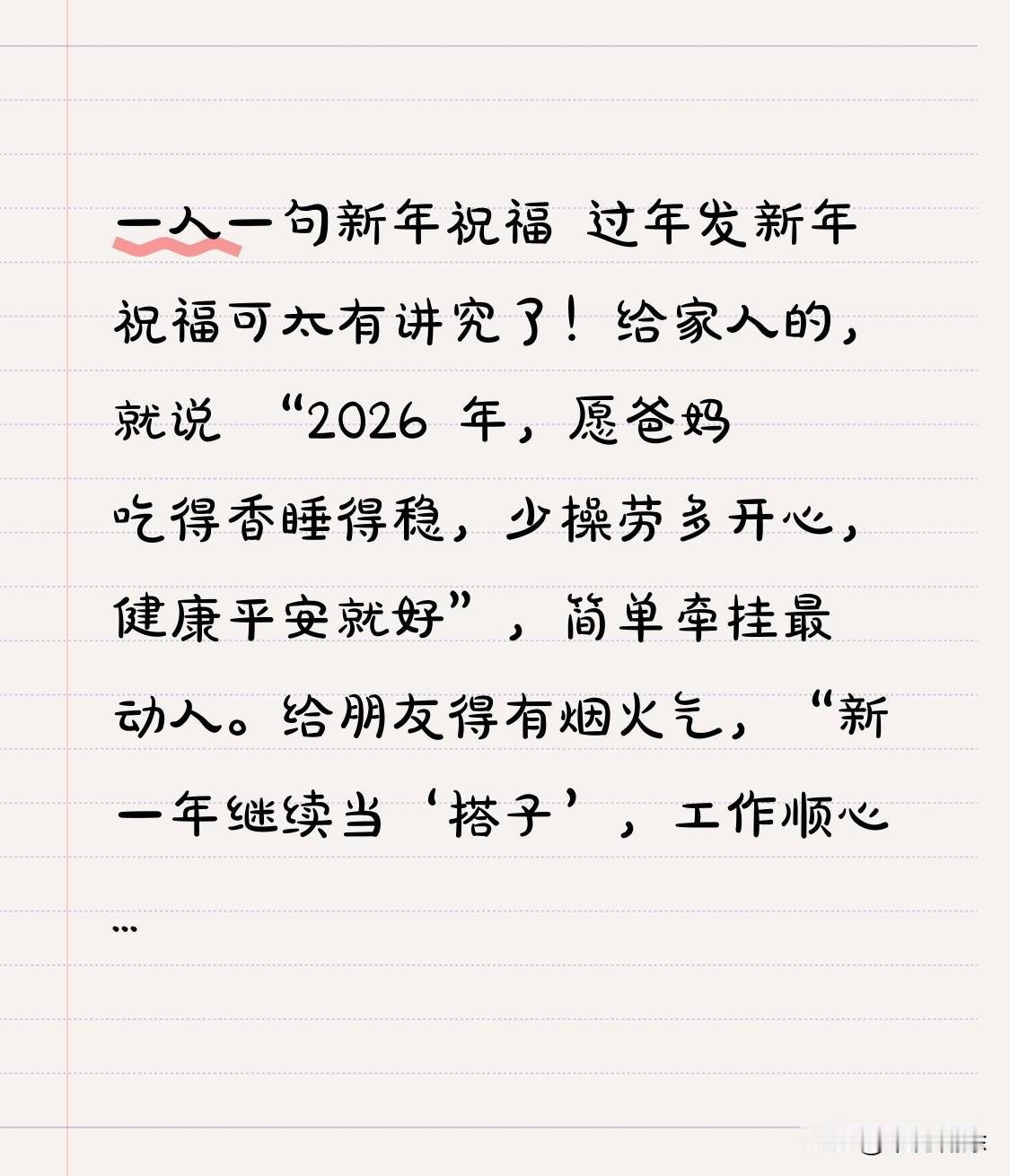 一人一句新年祝福 过年发新年祝福可太有讲究了!给家人的,就说 “2026 年,愿爸妈吃得香睡得稳,少操劳多开心,健康平安就好”,简单牵挂最动人。 给朋友得有烟火气,“新一年继续当‘搭子’,工作顺心钱包鼓,万事顺意好运常来”。 给同事呢,“新一年配合默契,工作顺利少加班,业绩长虹一起冲”。这么发,朋友圈不得被赞爆!
