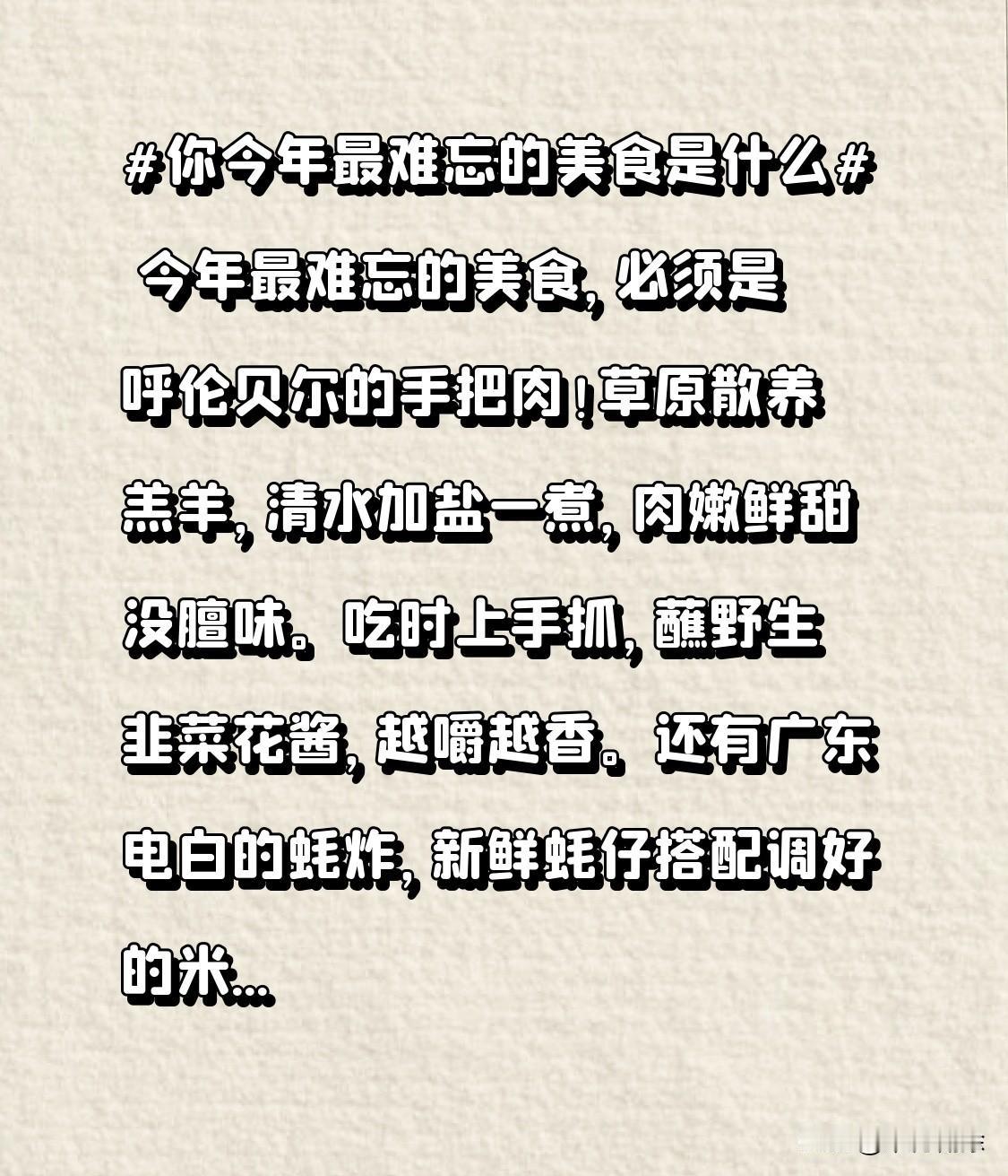 今年最难忘的美食,必须是呼伦贝尔的手把肉!草原散养羔羊,清水加盐一煮,肉嫩鲜甜没膻味。吃时上手抓,蘸野生韭菜花酱,越嚼越香。还有广东电白的蚝炸,新鲜蚝仔搭配调好的米糊,外酥里嫩,不愧是百年侨乡美食!