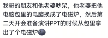 我哥的朋友和他老婆吵架,他老婆把他电脑包里的电脑换成了电磁炉,然后第二天开会准备演讲PPT的时候从包里拿出了个电磁炉