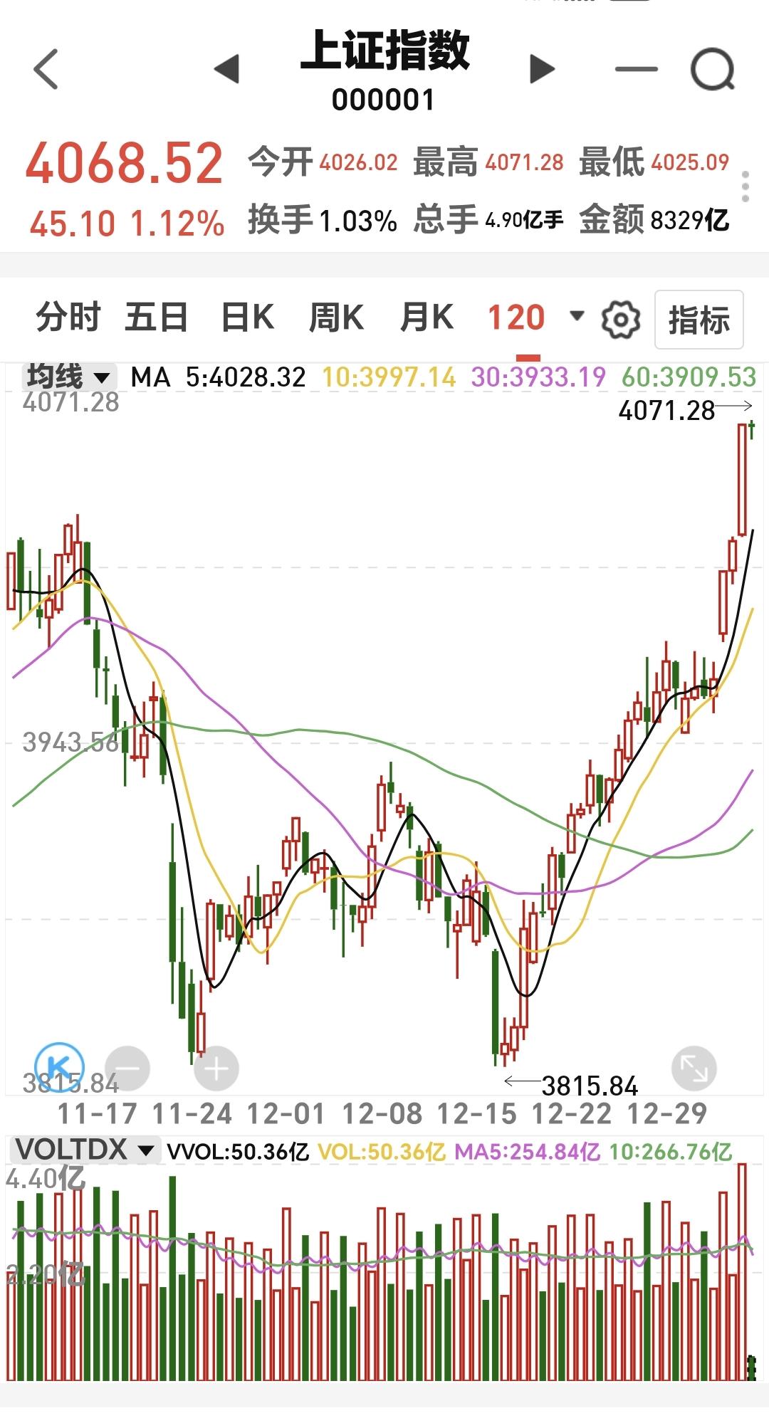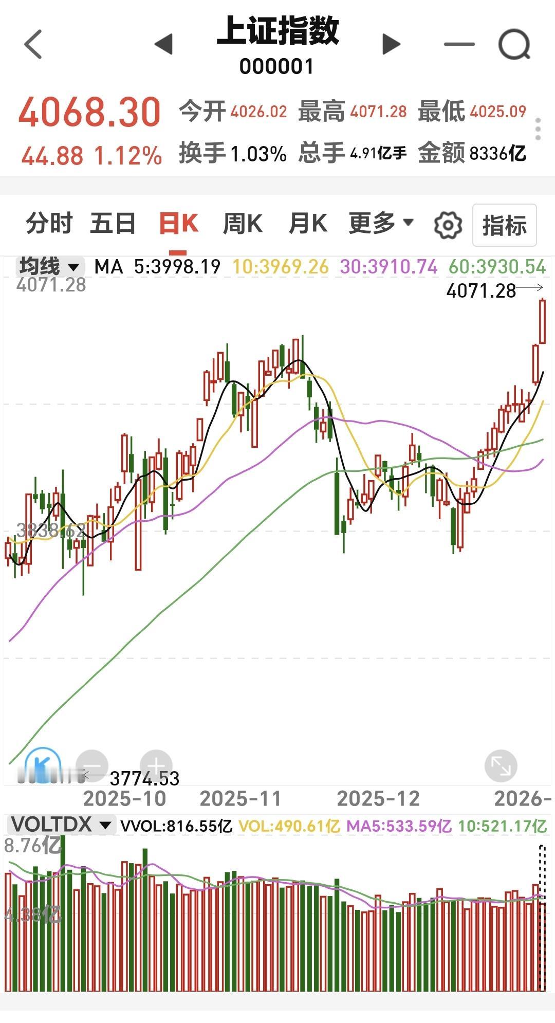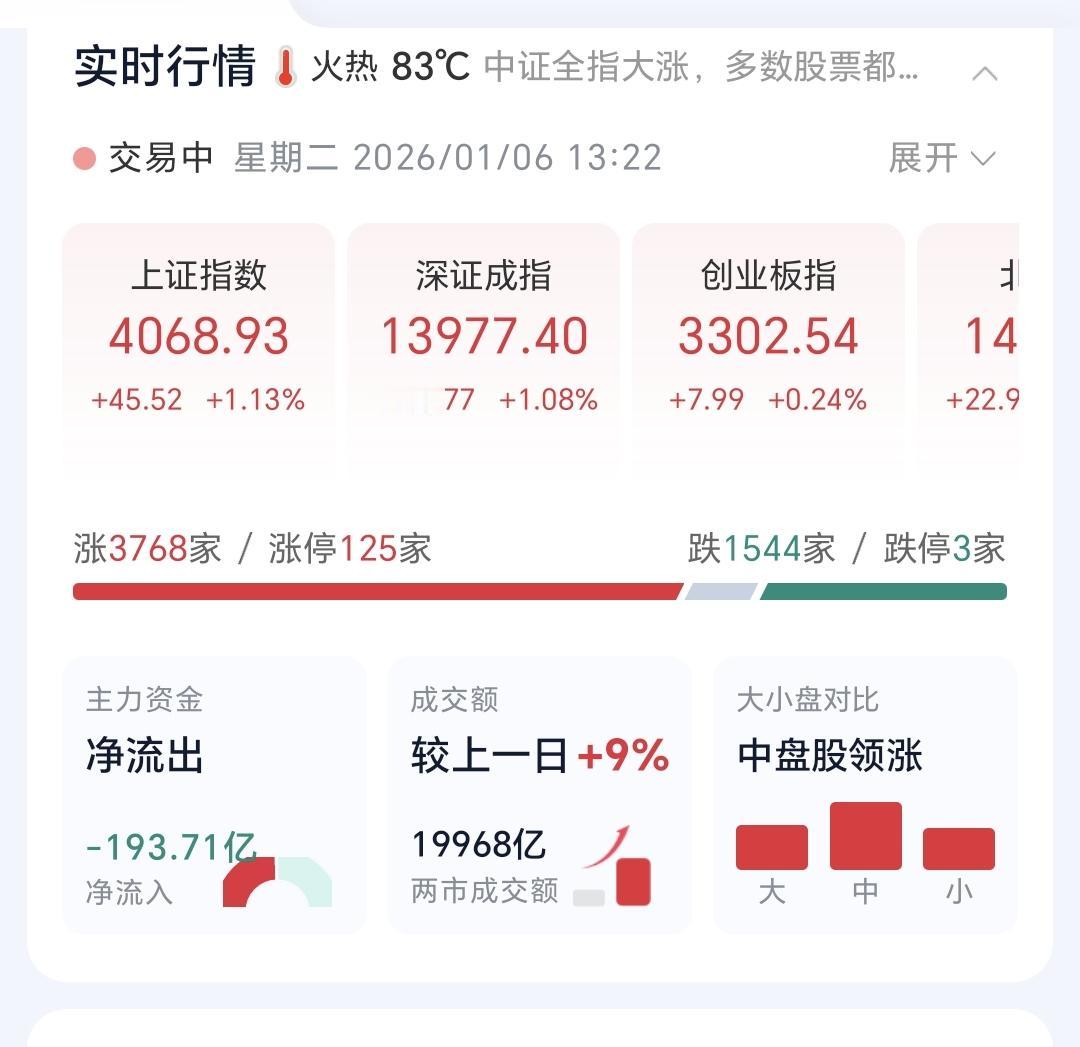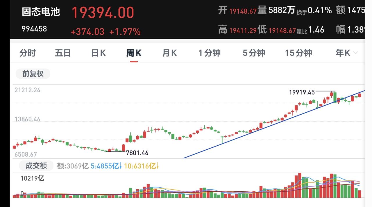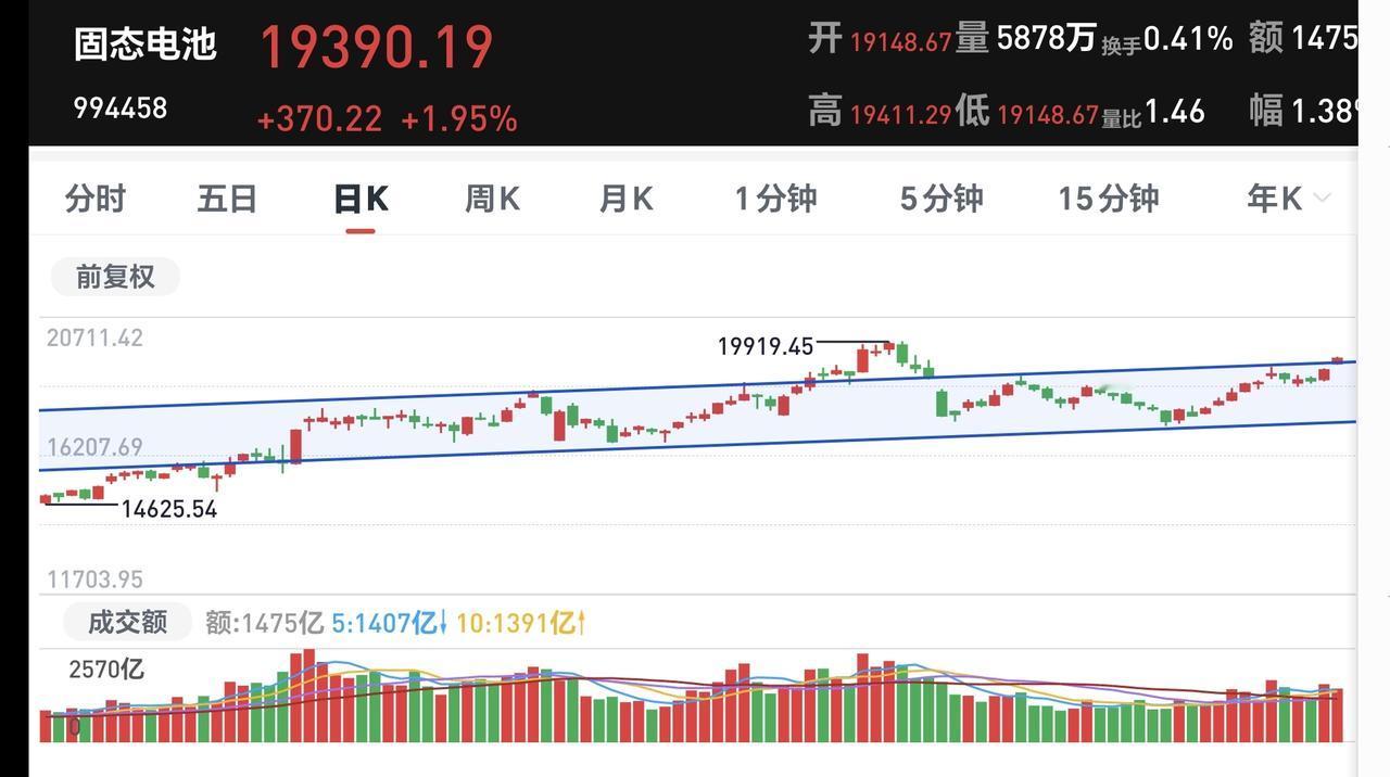 基金:近期会不会上涨到5000点 下午的市场继续红红火火,三大指数全面上涨,上证指数再创新高,大有一举突破5000点的气势,创业板指上涨了0.27%,盘中点位3303点,上证指数上涨了1.13%,盘中点位4068点。 整个股票市场,上涨3768家,下跌1544家,涨停125家,跌停3家,上涨家数多于下跌家数。 持有的基金中,盘中估值上涨幅度最大的三个板块是:证券板块,芯片半导体板块,军工板块,估值下跌的只有5G板块,估值整体上涨了9637元。 整个基金市场,上涨13794家,下跌5365家,上涨幅度超过5%的12家,没有下跌幅度超过5%的基金。 图9是今天基金的上涨排行榜,图10是今天基金的下跌排行榜,图11是ETF上涨幅度排行榜,图12是今天基金的加仓榜,图13是今天基金的减仓榜。 1:下午还是黄色线在蓝色线下方,但两条线之间的敞口很小,这么小的敞口,不足以影响盘面的走势。 2:现在两市累计成交19968亿,相比于昨天同期放量了9%,成交量方面也是比较平稳,并没有急剧的放大或者缩小。 3:我们来看一下下面的截图14,这是主力资金动向图,现在主力资金净流出183亿,超过了昨天同期38亿的净流出金额。 4:我们来看一下下面的截图15,这是主力资金进出板块的情况,主力资金净流入最多的三个板块是:有色金属板块,非银金融板块,大金融板块,主力资金净流出最多的三个板块是:高端制造板块,5G板块,通信板块。 5:我们来看一下下面的截图16,这是固态电池板块日K线图,从图中可以看出,我画了两条倾斜向上的斜线,这是固态电池板块日线级别上涨通道,只是这个上涨通道的斜率不大,今天的上涨突破了这个上通道的上轨,也就是说,这个板块日线级别有可能会走加速走势。 我们来看一下下面的截图17,这是固态电池板块周K线图,从图中可以看出,我画了一条倾斜向上的斜线,这是固态电池板块周线级别上涨趋势线,前段时间跌破了这条上涨趋势线,今天的上涨还没有能够重新回到这条上涨趋势线上方。 固态电池板块日线级别有可能会走加速走势,周线级别还没有收回到上涨趋势线上方,所以,持有的人可以继续持有,想进场的人需要谨慎考虑。 市场指数最近虽然涨势如虹,但近期到达5000点的可能性还是非常小的,市场大方向向上毋庸置疑,将来重上5000点也是肯定的,但最近的上涨需要谨慎,上涨幅度越大,我们越是要谨慎,上涨了舍得抛,下跌了敢于捞,做到这两点就可以了。 今天究竟应该怎么办?我会在评论区留言。 我每天都会分享我的观点,我的观点只代表我个人的看法,不能作为你操作的依据,据此操作后果自负。