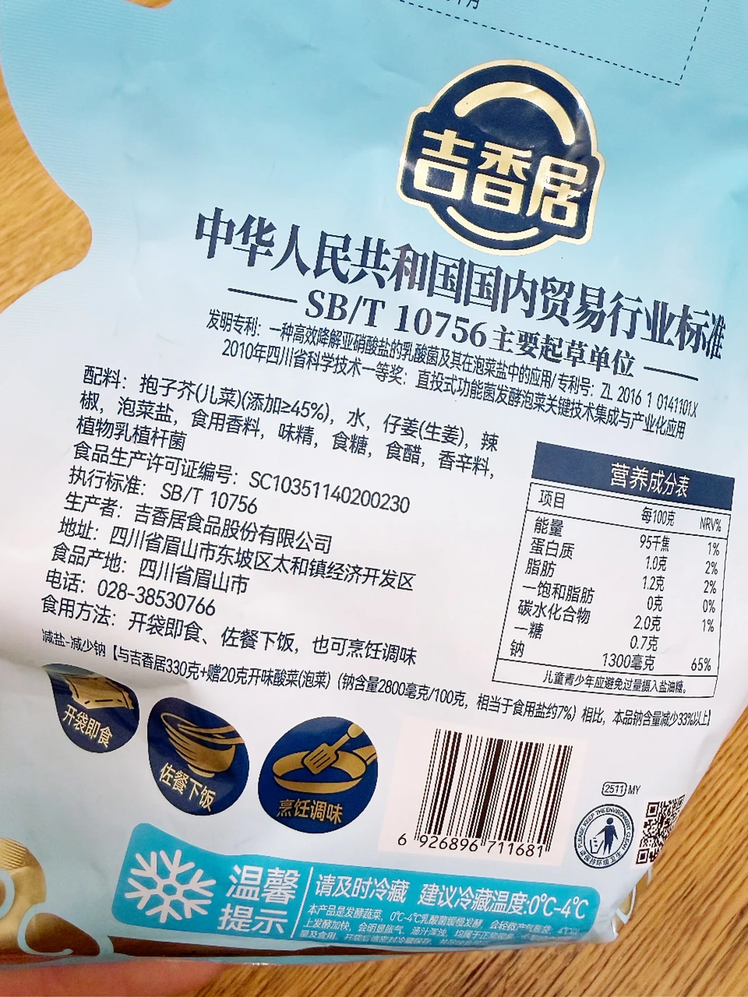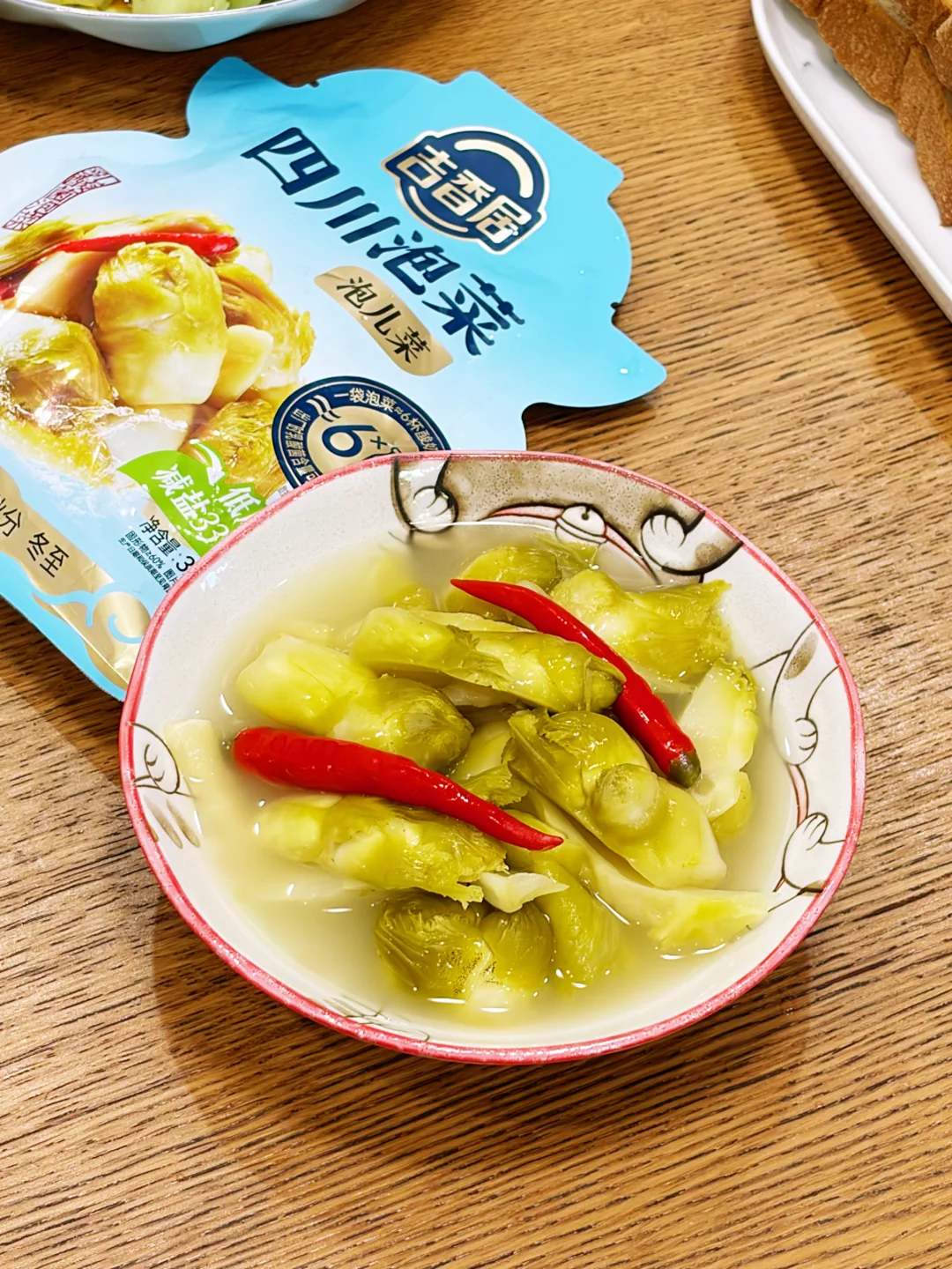 都说川喻人爱吃、会吃,这回我服了 北方的冬天特别干燥,胃口也跟着一样没精神 闺蜜安利的吉香居泡儿菜,赶紧安排上 早餐开一袋,酸香开胃,脆嫩爽口,配啥都好吃 配料表干净,乳酸菌母水发酵,手工鲜泡 专利技术高效降解亚硝酸盐 减盐33%以上,低脂,全家吃着放心 真是拯救“没味口”的神器啊