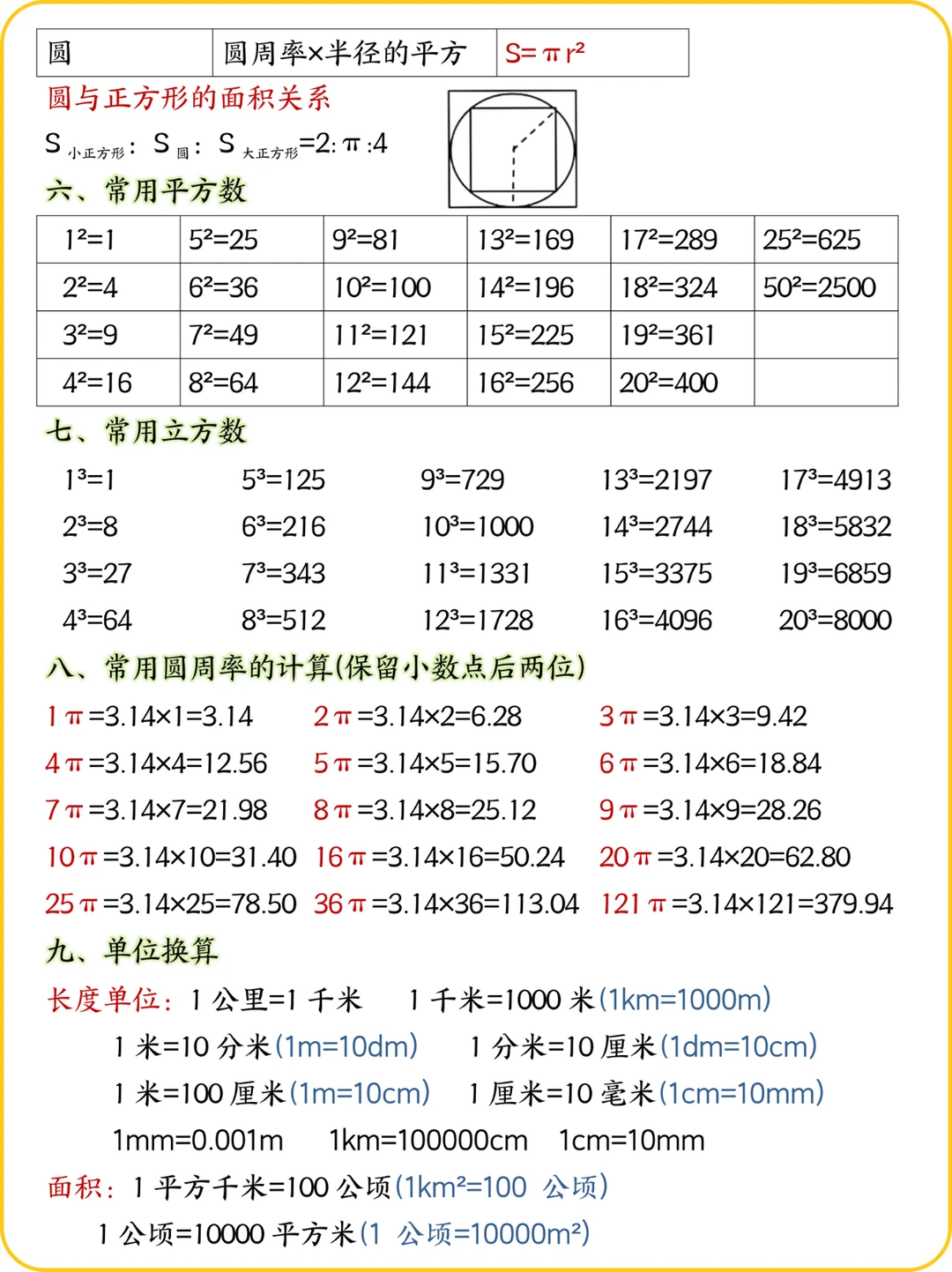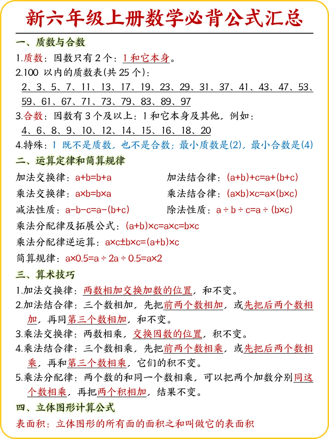 [彩虹R]六年级上册数学期末冲刺不用慌!这份复习计划 + 必背公式直接抄作业~ [清单R]复习计划分 3 阶段: 基础梳理周: [一R]啃分数乘除、位置方向:搞定分数运算(正确率≥95%)、位置相对性表述; [二R]攻比、圆、百分数:掌握比的化简、圆的周长面积(零单位错)、百分数互化。 专项突破周 [向右R]分计算(限时练:10 分钟 12 题)、图形统计(圆 / 扇形图)、应用(单位 “1” 应用题)、数学广角(数与形规律),精准补短板。 综合冲刺周 [向右R]刷 3-5 套卷 + 复盘高频错(比如分数应用题单位 “1”、圆面积),再练实践题(确定起跑线、节约用水)。 必背公式重点: [一R]计算类:运算律、分数除法 = 乘倒数、比的基本性质; [二R]图形类:圆 C=2πr/S=πr²、长方体 / 圆柱表面积 & 体积; [三R]应用题类:路程 / 工程公式、植树 / 盈亏问题公式; [四R]实用包:常用平方数、圆周率倍数(1π-25π)、单位换算(面积 / 体积)。