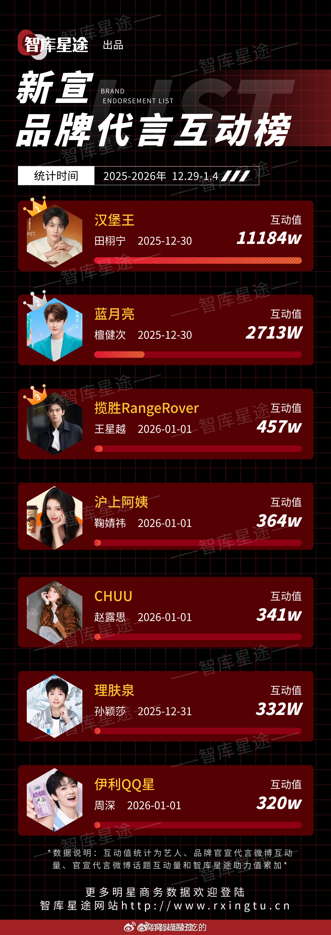 新宣代言品牌互动榜排名来咯 田栩宁—汉堡王 檀健次—蓝月亮 王星越—路虎揽胜 鞠婧祎—沪上阿姨 赵露思—CHUU 孙颖莎—理肤泉 周深—伊利QQ星