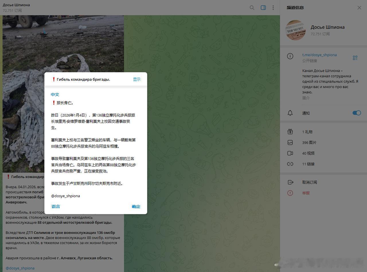 乌克兰方面的消息称俄军第58集团军第136近卫摩步旅旅长因交通事故死亡 乌方信源发出的消息,俄方印证消息还没找到。消息指第136近卫摩步旅旅长因交通事故死亡。2026年1月4日,第136独立摩托化步兵旅旅长谢利莫夫·埃里克·安韦罗维奇上校因交通事故身亡。该旅旅长乘坐的汽车载有他本人及其三名警卫,与一辆载有第3卢甘斯克集团军第88独立摩托化步兵旅军人的乌阿斯牌汽车相撞。事故导致谢利莫夫及三名第136独立摩步旅军人当场死亡。事发时在乌阿斯车内的两名第88独立摩步旅军人伤势严重,医生正在全力抢救其生命。事故发生在卢甘斯克州阿尔切夫斯克市附近。