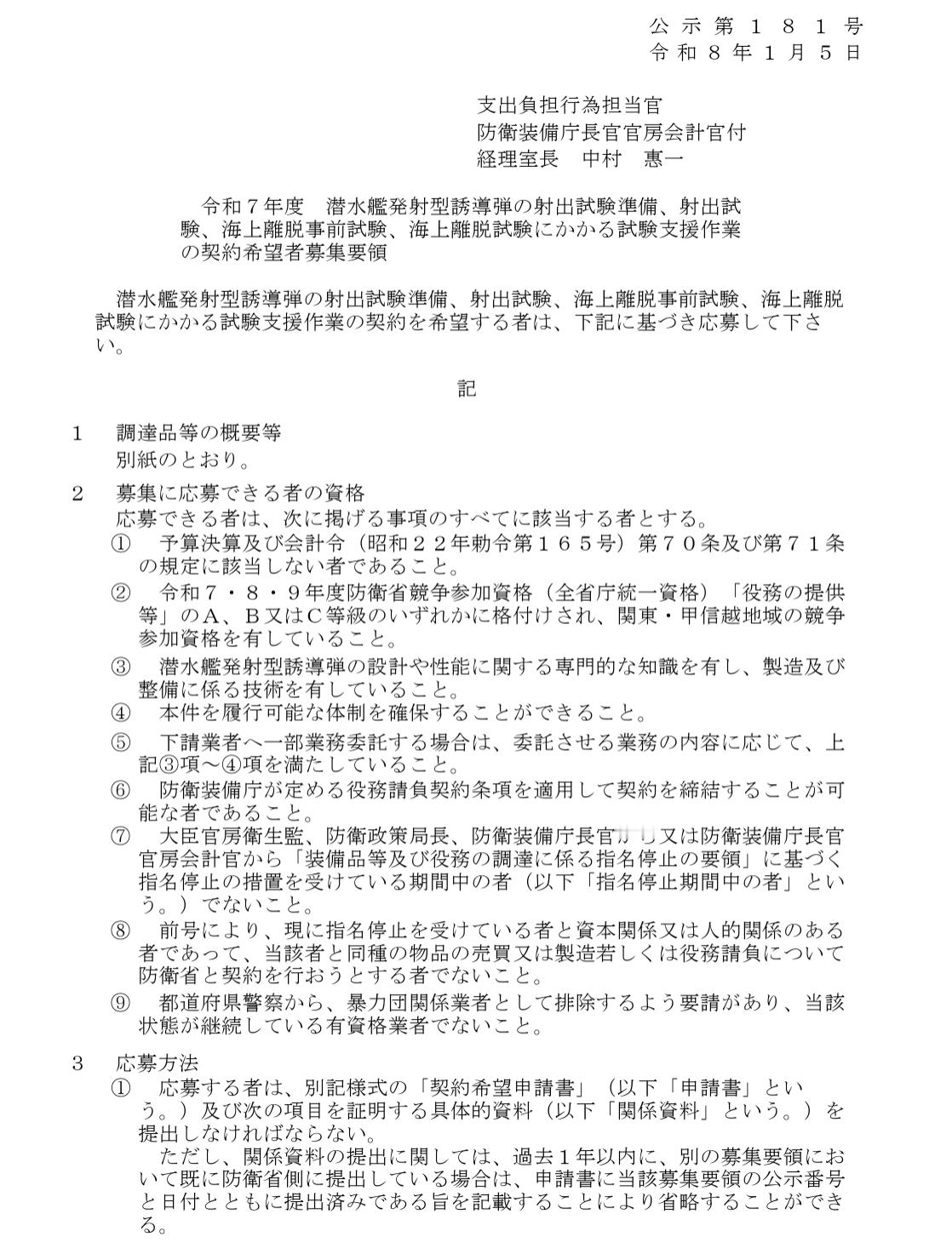 ATLA发布“潜水艦発射型誘導弾”发射测试支援作业的招标