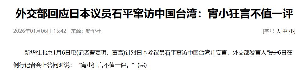 被我方制裁的大汉奸、日本参议员石平1月6日写道:“我现在在羽田机场。我要去台湾了。今天是个阳光明媚的日子。我心情很好。” 听听这话,是不是觉得特别刺耳?就在咱们为了国家统一厉兵秣马的时候,这个流着中国人的血、却长着一颗日本心的家伙,居然敢在这个节骨眼上公然挑衅! 这哪里是去旅游,这分明就是去给“台独”势力打气撑腰,是赤裸裸地向14亿中国人的底线宣战! 更令人气愤的是,这厮一落地台北松山机场,那股子媚日求荣的奴才相就彻底藏不住了。他居然大言不惭地宣称自己“踏上了台湾国土”,还妄称两岸是“完全不同的国家”。 我就想问问,石平啊石平,你是不是忘了自己是从哪儿出来的?你那个北大毕业生的光环,早就被你这些年干的龌龊事给抹得一干二净了! 你以为你换了个日本名字叫“石平太郎”,就能洗刷掉你背叛祖宗的罪孽吗?做梦!对于这种主动送上门的挑衅,咱们外交部的回应那叫一个解气! 面对记者的提问,外交部发言人毛宁连正眼都没瞧他一下,只冷冷地回了一句:“宵小狂言不值一评。”什么叫大国风范?这就是! 对于这种为了博眼球不惜出卖灵魂的小丑,多说一个字都是抬举他。咱们的蔑视,就是对他最狠的耳光!你以为你是个人物?在咱们眼里,你不过就是个秋后的蚂蚱,蹦跶不了几天了! 大家可能还记得,就在几个月前的2025年9月8日,咱们国家可是动了真格的。依据《反外国制裁法》,外交部直接宣布对石平采取全面反制措施! 冻结他在华财产、禁止与中国实体交易、禁止他本人及直系亲属入境!当时发言人林剑那句“数典忘祖、卖祖求荣”骂得是真痛快! 可这人呢?不仅不知悔改,反而变本加厉,这次窜访台湾,摆明了就是想用这种极端的方式向他的日本主子表忠心。说到底,石平这种人就是典型的政治投机分子,是现代版的“汉奸”。 他为什么要选在这个时候去台湾?还不就是看准了现在台海局势紧张,想给自己刷刷存在感吗?他心里清楚得很,自己在日本右翼势力眼里,也就是个“临时话筒”。 只有不断地攻击中国,不断地制造话题,他才能从主子那里讨到几块骨头吃。为了这点可怜的利益,他连南京大屠杀都敢否认,连靖国神社都敢去拜,这种人还有什么底线可言? 可是,石平啊,你是不是太高估了自己在美日棋盘上的分量?你以为你去了台湾,跟着那帮“台独”分子喊两句口号,就能改变什么吗?简直是痴人说梦! 现在的台海局势,主动权完全掌握在咱们手里。解放军的常态化演训,正在一步步压缩外部干预的空间。你这种时候跑过去,除了给局势添把火,让自己死得更快一点之外,没有任何意义。 等到真的动起手来,你觉得你那个日本主子会为了你这么一条狗,跟中国彻底翻脸吗? 再看看那个所谓的“私有化”和西方那一套,在美国洛杉矶大火里都露馅了,你石平还在这儿捧臭脚呢?你以为投靠了美日阵营就进了保险箱?别逗了! 看看那些被你吹捧的西方政客,关键时刻连自己国民的死活都不管,还能管你一个外人?在他们眼里,你不过就是个随时可以抛弃的耗子。 一旦你失去了利用价值,你的下场绝对比谁都惨!而且,你以为你入了日本籍,日本人就真把你当同胞了?别天真了! 在日本那个等级森严的社会里,一个能轻易背叛自己祖国和故乡的人,是永远得不到真正尊重的。 人家表面上用你,背地里指不定怎么笑话你呢! 就像有日本网友讽刺的那样:“一个连自己祖宗都能卖的人,谁敢真的信任他?”这话说得太对了!你在他们眼里,永远是个异类,是个随时可能再次背叛的隐患。 这次他在羽田机场说天气好,我看他这是“回光返照”吧!他以为只要闭上眼睛,就能装作看不见中国日益强大的现实?他以为只要躲在键盘后面,就能逃脱历史的审判? 咱们的《反外国制裁法》可不是摆设,对石平的制裁,不仅仅是罚点钱那么简单,更是在向全世界宣告:凡是危害中国主权和安全的人,不管你跑到天涯海角,都别想有好日子过!