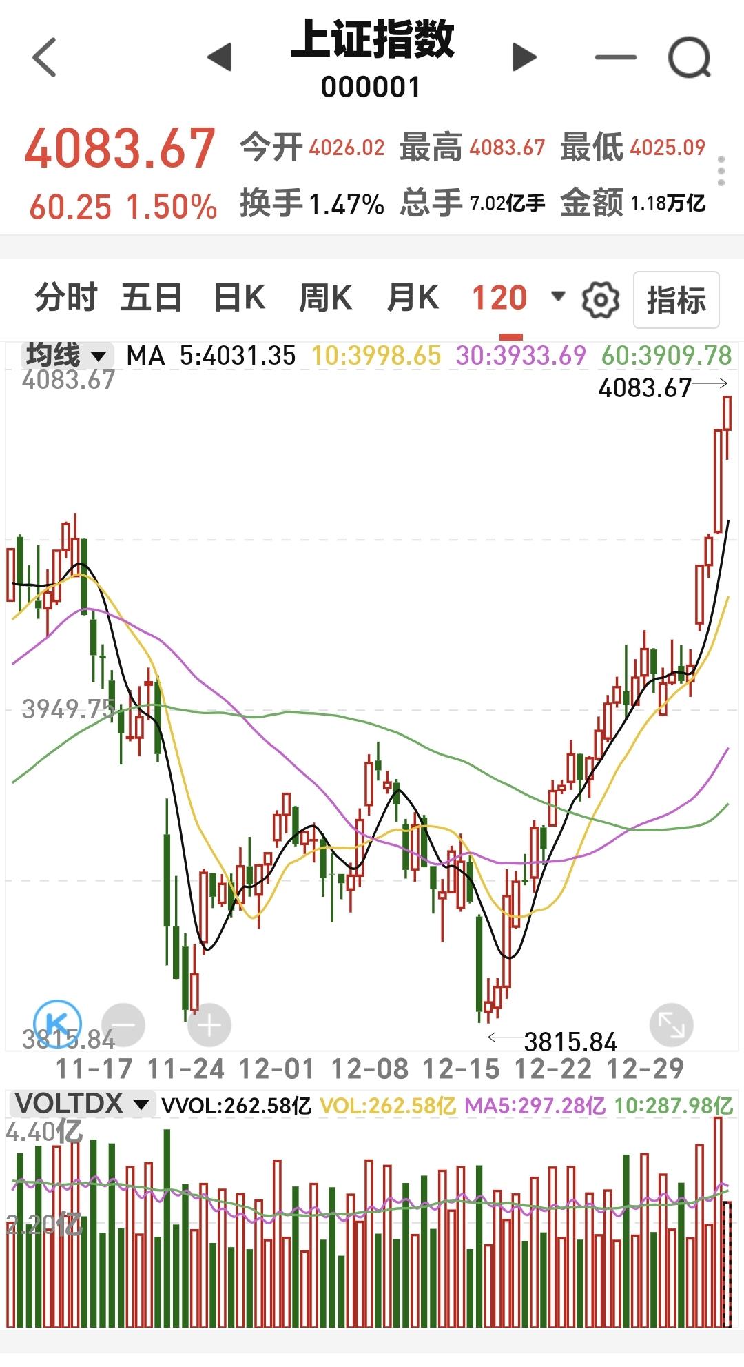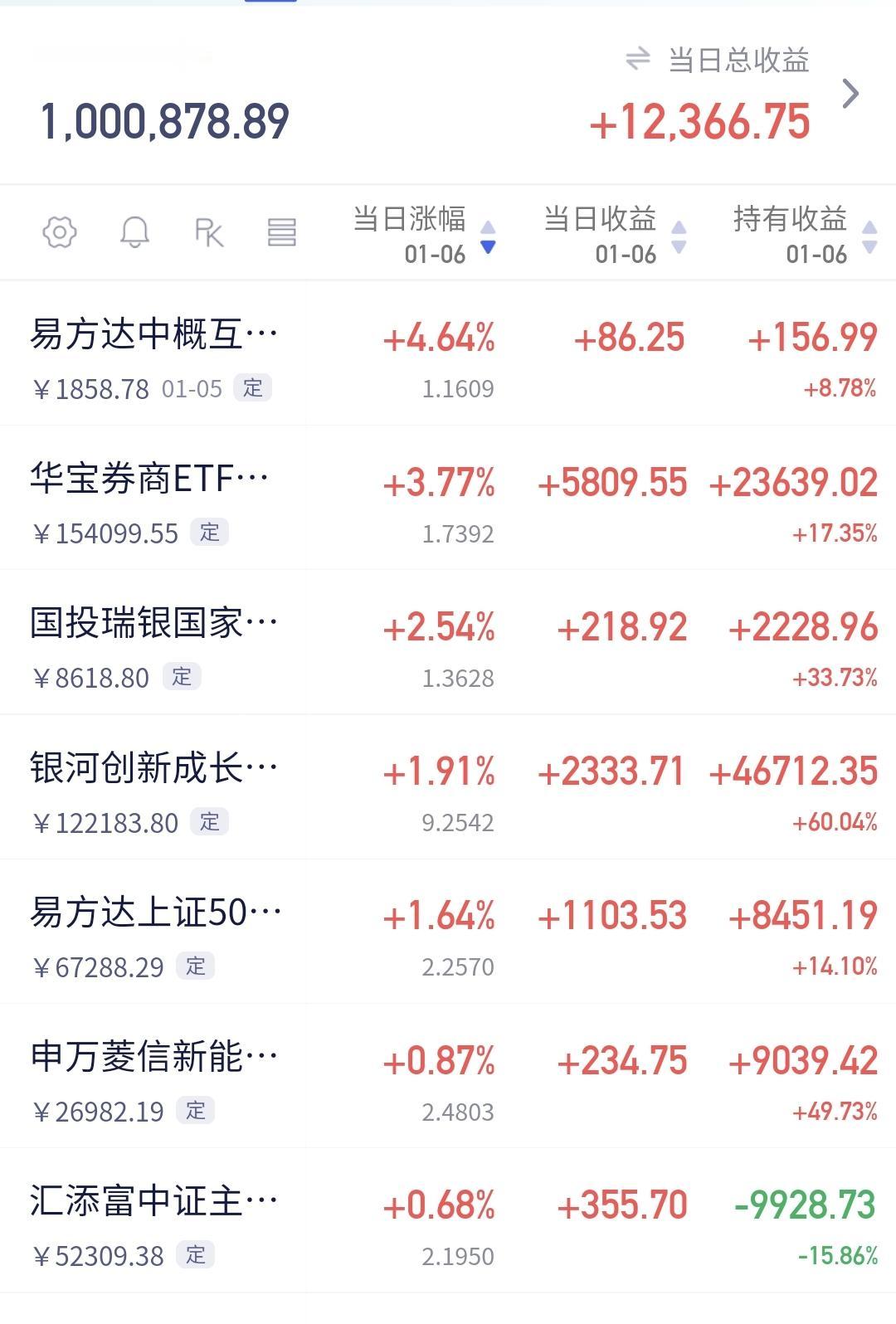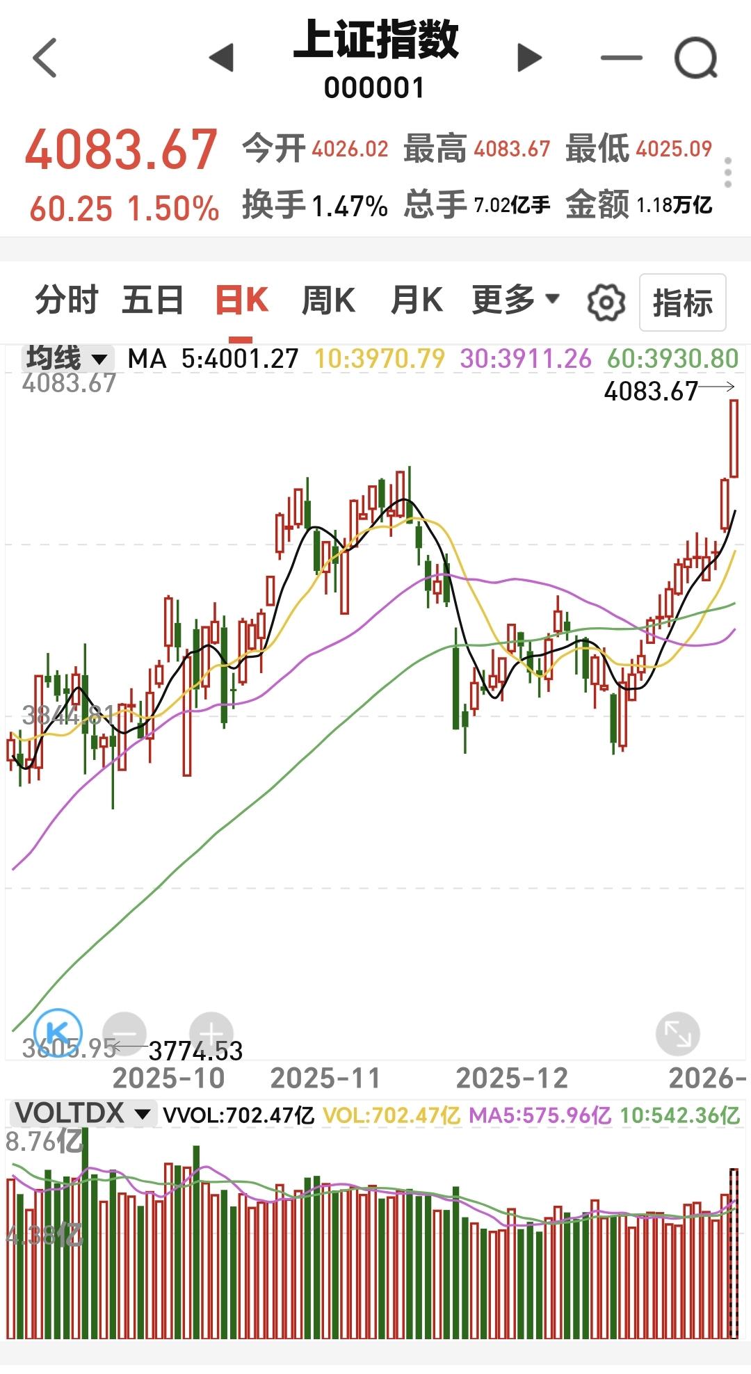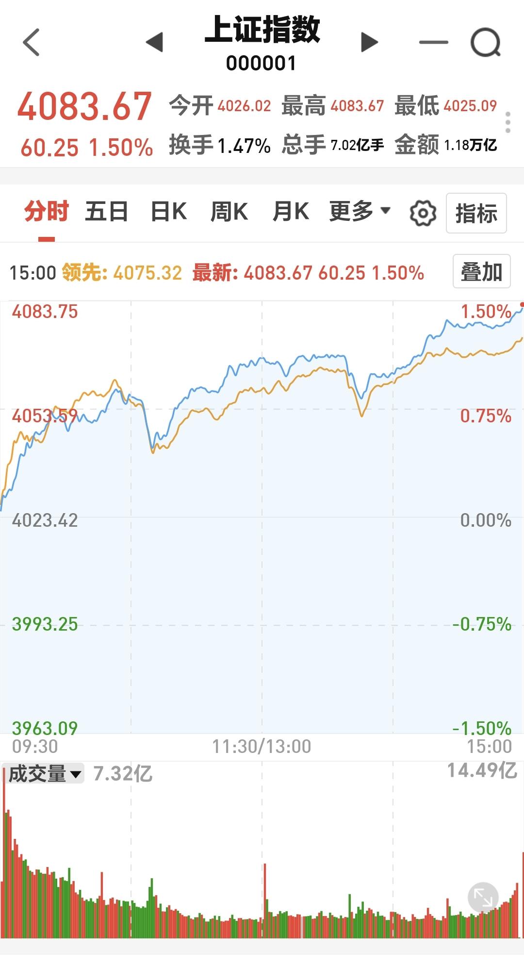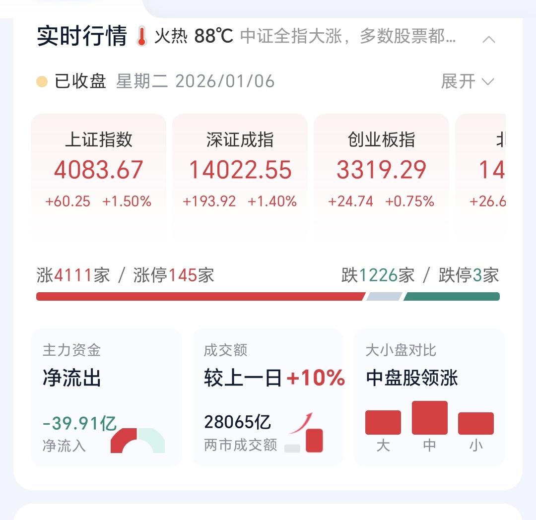 基金:市场指数连续大涨,为什么要给你浇一盆冷水 市场在昨天开门红大涨之后,今天继续大幅度上涨,并创造了历史性的13连阳,上证指数再创新高,以盘中最高点收盘,这个新高也是近十几年以来的最高点,收盘的时候,创业板指上涨了0.75%,收于3319点,上证指数上涨了1.50%,收于4083点。 整个股票市场,上涨4111家,下跌1226家,涨停145家,跌停3家,上涨家数多于下跌家数。 今天两市累计成交28065亿,相比于昨天放量了10%,内资净流出170亿。 持有的基金中,下午收盘的时候,估值上涨幅度最大的三个板块是:证券板块,军工板块,芯片半导体板块,估值下跌的只有5G板块,估值整体上涨了12366元。 整个基金市场,上涨14135家,下跌5045家,上涨幅度超过5%的14家,没有下跌幅度超过5%的基金。 图9是今天基金的上涨排行榜,图10是今天基金的下跌排行榜,图11是ETF上涨幅度排行榜,图12是今天基金的加仓榜,图13是今天基金的减仓榜。 1:今天市场指数继续狂飙,已经接近了4100点,连续大幅度上涨是好事,但也不是好现象,2024年的924,大家应该是记忆犹新,那样的大涨之后,调整的时间在半年以上,这次应该不会有924那样的大幅度上涨,但现在的速度也不慢,只要这个速度降下来,就有形成大级别高点的可能性,这是我在市场大涨的时候,给大家浇的一盆冷水,目的是让大家冷静,因为已经有人看近期会冲到5000点上方了。但需要强调的是,市场的大方向还是向上的,在大方向上,我们必须要坚定的看多做多。 2:今天成交量达到了28000亿以上,昨天放量了20%左右,今天放量了10%左右,后面我们观察成交量的时候,要注意两个方面,一个是突然急剧放量,放大到3万亿以上,出现滞涨的情况,另一个是突然积聚数量,在急剧缩量的情况之下还在上涨,这两种情况都需要引起我们的重视。 3:这一次上冲到4100点上方的可能性是很大的,到时候有可能会有人声鼎沸,这个人声鼎沸是阶段性的,这个人声鼎沸形成的高点也是阶段性的,今年的高点在下半年,今年的高点在4600点上方。 4:明天如果继续冲高,盘中很有可能会冲高回落,到时候需要看回落的速度,如果回落的速度特别快,是需要注意的,这也是我这两天不建议追涨的原因,宁可错过,不可做错,错过了,只是少挣点钱,做错了,有可能会被套在高位,我们玩基金的前提是本金的安全,本金安全比挣钱多少更重要,我近期没有进场的打算,我近期是找机会进行再一次止盈。 我每天都会分享我的观点,我的观点只代表我个人的看法,不能作为你操作的依据,据此操作后果自负。