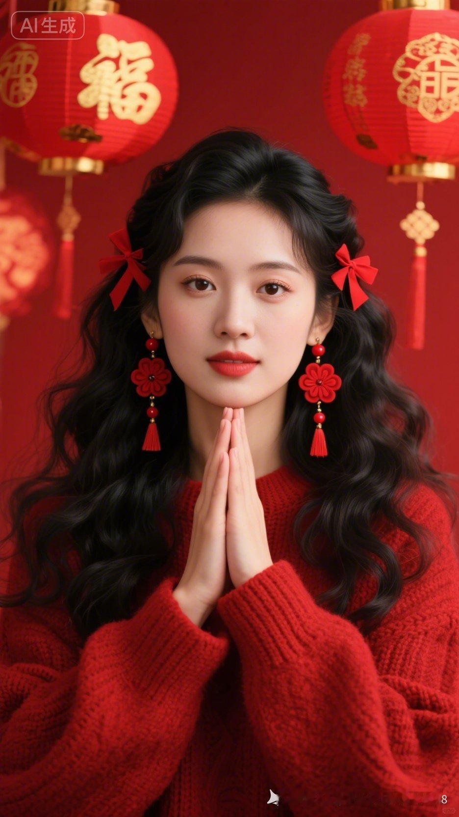 穿红衣的姑娘双手合十,背景挂红灯笼。