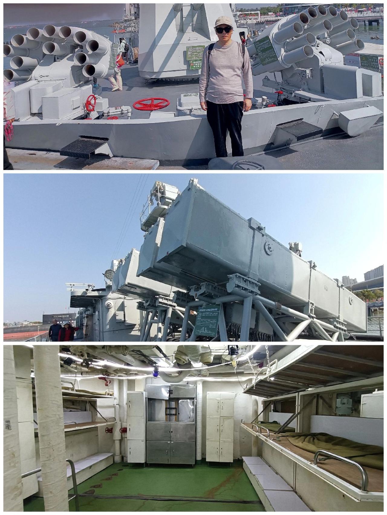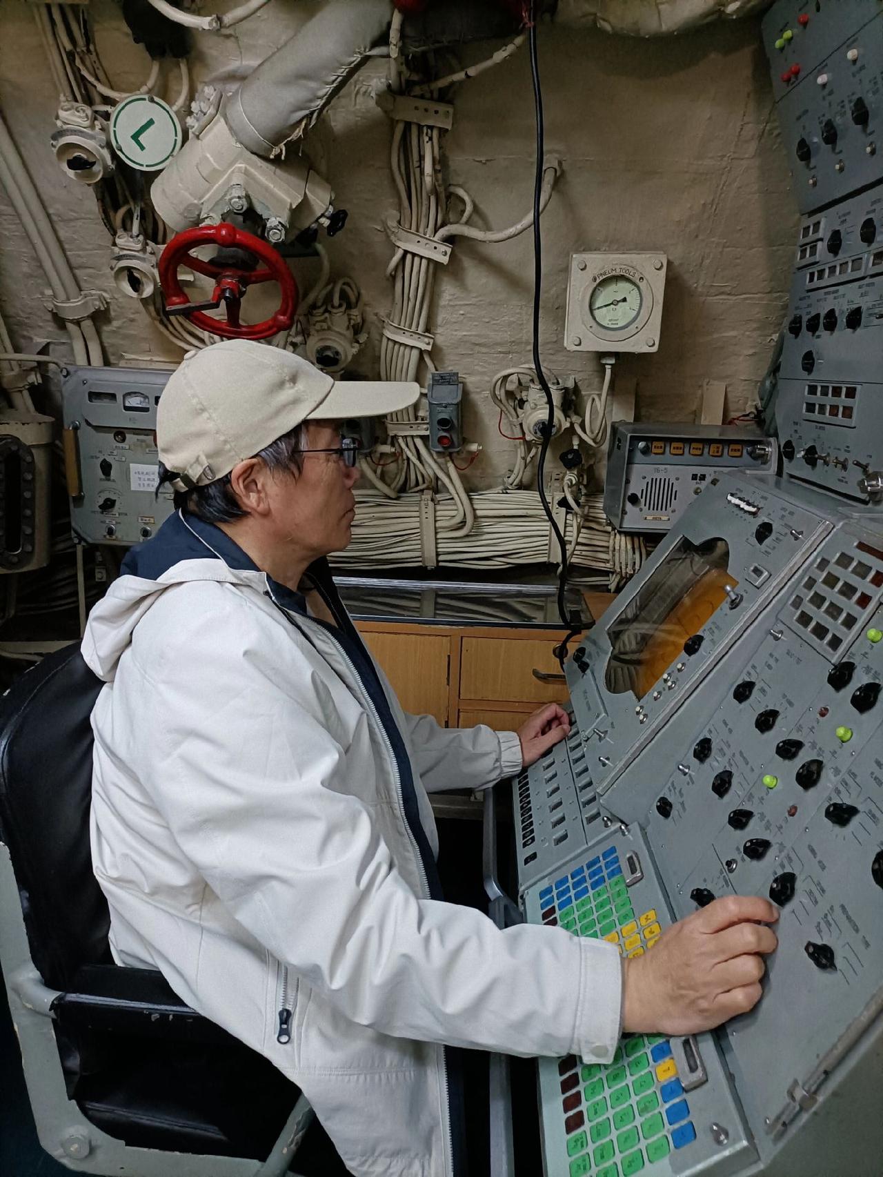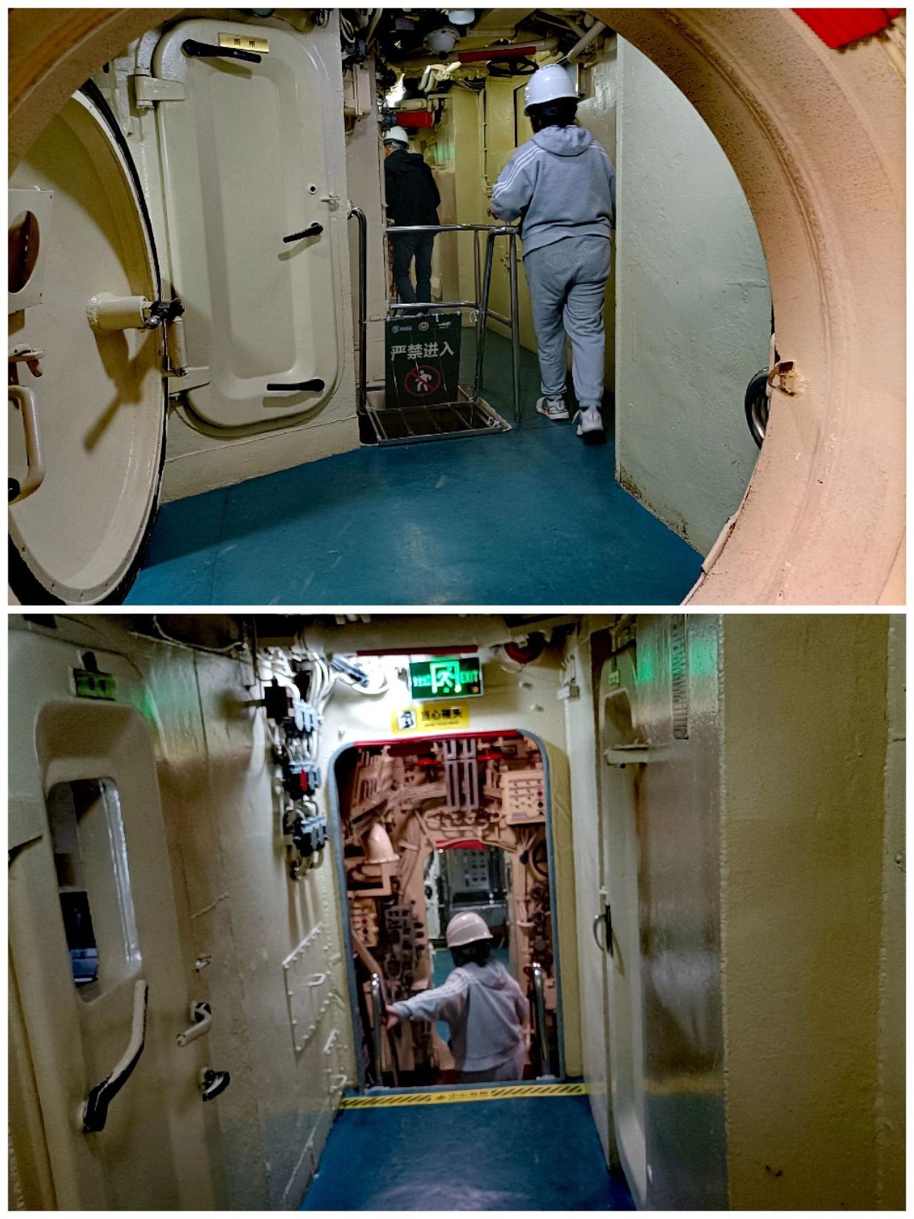 开潜艇(图5),上军舰,踌躇满志,在湛江军博园海上装备区,湛江舰上再体验一把军人之姿(图8)。 即将进入这艘潜艇,和进入后满机器管道的内部通道(图1),潜艇指挥塔展雄风(图2),潜艇内部狭窄的宿舍通道和寝室(图3),连接潜艇各舱的圆门和上下潜艇内部的楼梯(图4)。 开始踏上这艘湛江舰和舰上的尾炮(图6),舰上的舰首炮(图7),舰首炮左右的近防炮,舰中部的导弹以及舰甲板下的士兵寝室(图9)。