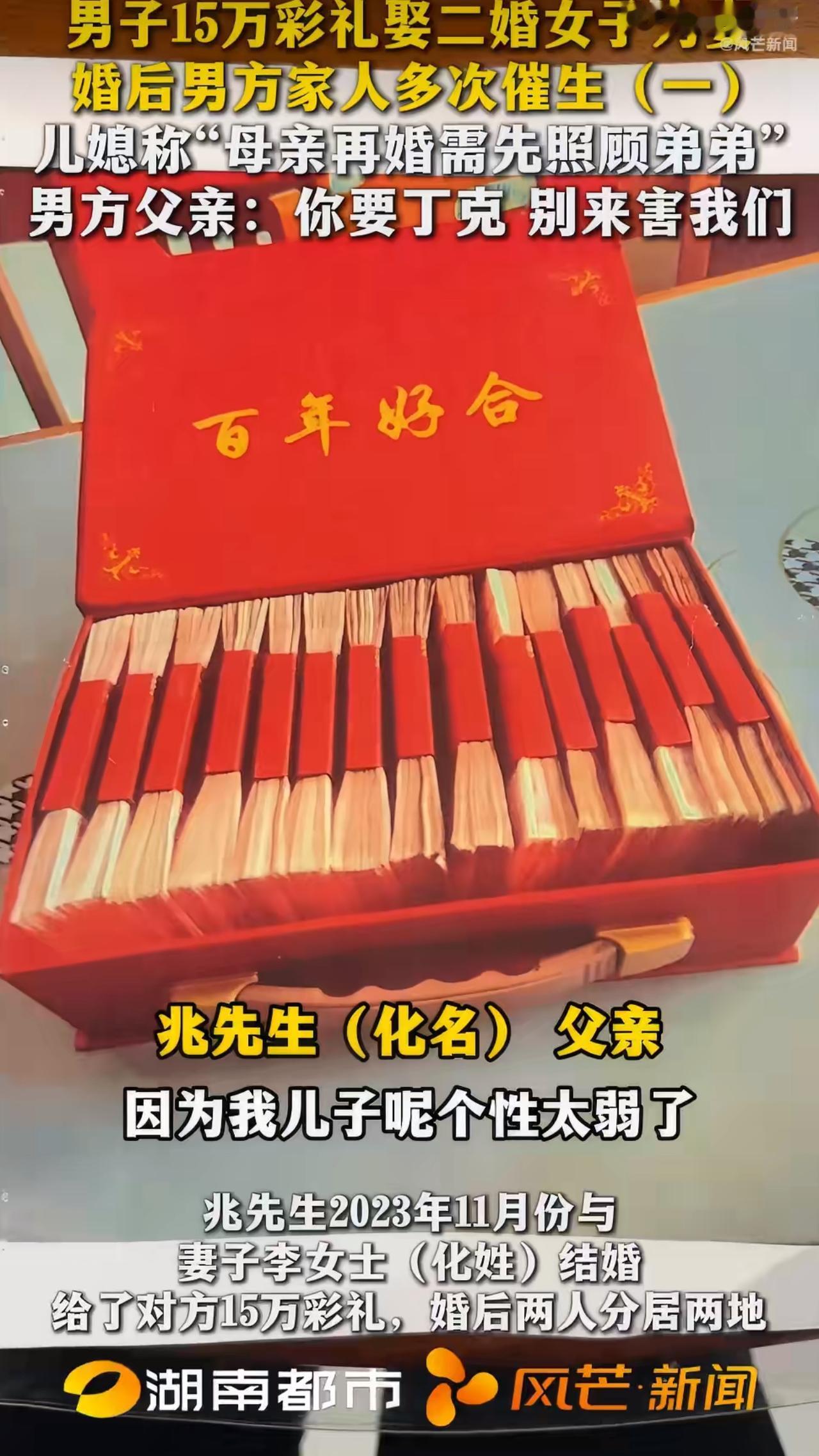 最近,湖南长沙发生了一件引发广泛讨论的事儿:兆先生花15万彩礼娶了二婚的李女士,结果婚后两年都没圆房,妻子还突然提出要丁克,这事儿搁谁身上都得炸锅,咱们今天就唠唠这背后的门道。 兆先生和李女士结婚时,男方家按传统习俗给了15万彩礼,这笔钱对普通家庭来说不是小数目,背后藏着“传宗接代”的期待——毕竟在中国,婚姻常被看作情感、经济和生育的综合契约,可新婚第一夜,妻子就和闺蜜挤一张床,婚后两年更是以“照顾弟弟”“男方无生育能力”等理由拒绝圆房,后来兆先生体检证明自己没问题,妻子又改口说“要丁克”,这一连串操作,直接把兆先生逼到怒告妻子“骗婚”,这事儿从女方角度看,她给出的理由是“照顾母亲再婚生的弟弟”和“个人选择丁克”。但网友们可不买账,有人扒出“弟弟”可能是她前段婚姻的孩子,甚至猜测她压根没打算和兆先生长期过日子。更扎心的是,男方父亲那句“你要丁克别来害我们”,道出了传统观念里“无后为大”的焦虑——对长辈来说,彩礼不仅是钱,更是对家族延续的担保。 其实类似的矛盾早有先例,比如有对夫妻恋爱时女方承诺“丁克”,婚后却偷偷怀孕;还有案例里女方收高额彩礼后拒绝领证,男方人财两空。这些事儿都指向一个核心问题:婚姻里的“共识”太容易被打破,就像建房子,生育观、经济规划、家庭责任是地基,地基没打牢,稍微有点风吹草动就容易塌。从法律层面说,彩礼能不能退得看具体情况。如果没领证,或者领证后没共同生活,法院一般会支持退还;但要是像兆先生这样已经共同生活两年,想靠“丁克”要回彩礼,法律上很难成立,毕竟丁克是个人选择,不是退彩礼的法定理由。 这事儿也给咱们提了个醒:结婚不是“搭伙过日子”,而是“合伙开公司”,婚前得把生育、经济、赡养老人这些“股权分配”谈清楚,最好签个“婚前协议”——不是算计,而是给彼此安全感,比如约定“如果一方反悔丁克,该怎么补偿”“彩礼怎么用”,甚至“未来生育后谁来带娃”,这些看似不浪漫的细节,反而能避免婚后撕破脸。 说到底,婚姻里最可怕的不是矛盾,而是“我以为你懂,你却从来没说过”,兆先生的悲剧,本质上是婚前共识缺失和沟通彻底失败的结果,现在年轻人追求个性没错,但既然选择结婚,就得学会在自我和责任之间找平衡——毕竟,婚姻不是两个人的事,而是两个家庭的终身项目。 事件来源:风芒新闻