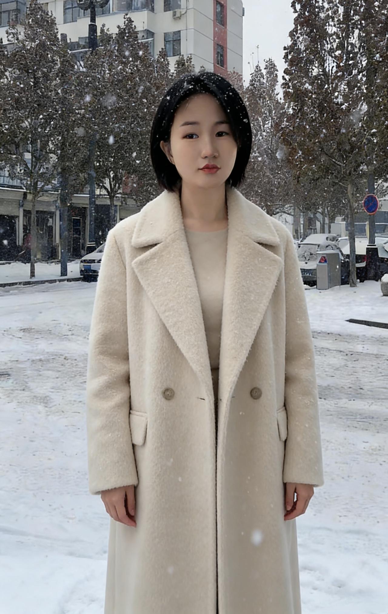 雪把世界揉成了奶白色 她站在雪地里 像一株安静的白玉兰 大衣的暖 抵着雪的寒 身后的街景是模糊的背景板 车辆与行人都成了虚影 ~ 雪片慢悠悠地落 落在大衣上,落在发梢 也落在心上 轻轻的,软软的 像一场温柔的拥抱 把尘世的喧嚣都隔在外面