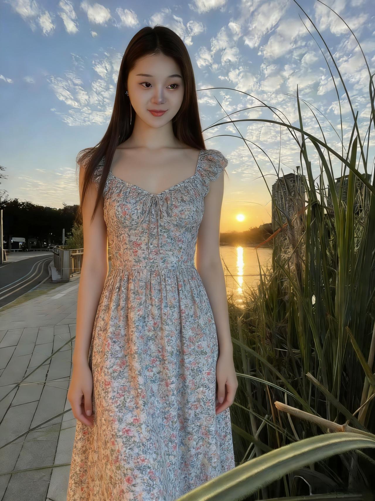 一袭花裙立斜阳,金辉点点洒路旁。 风拂发丝轻似梦,眸光清澈胜秋江。