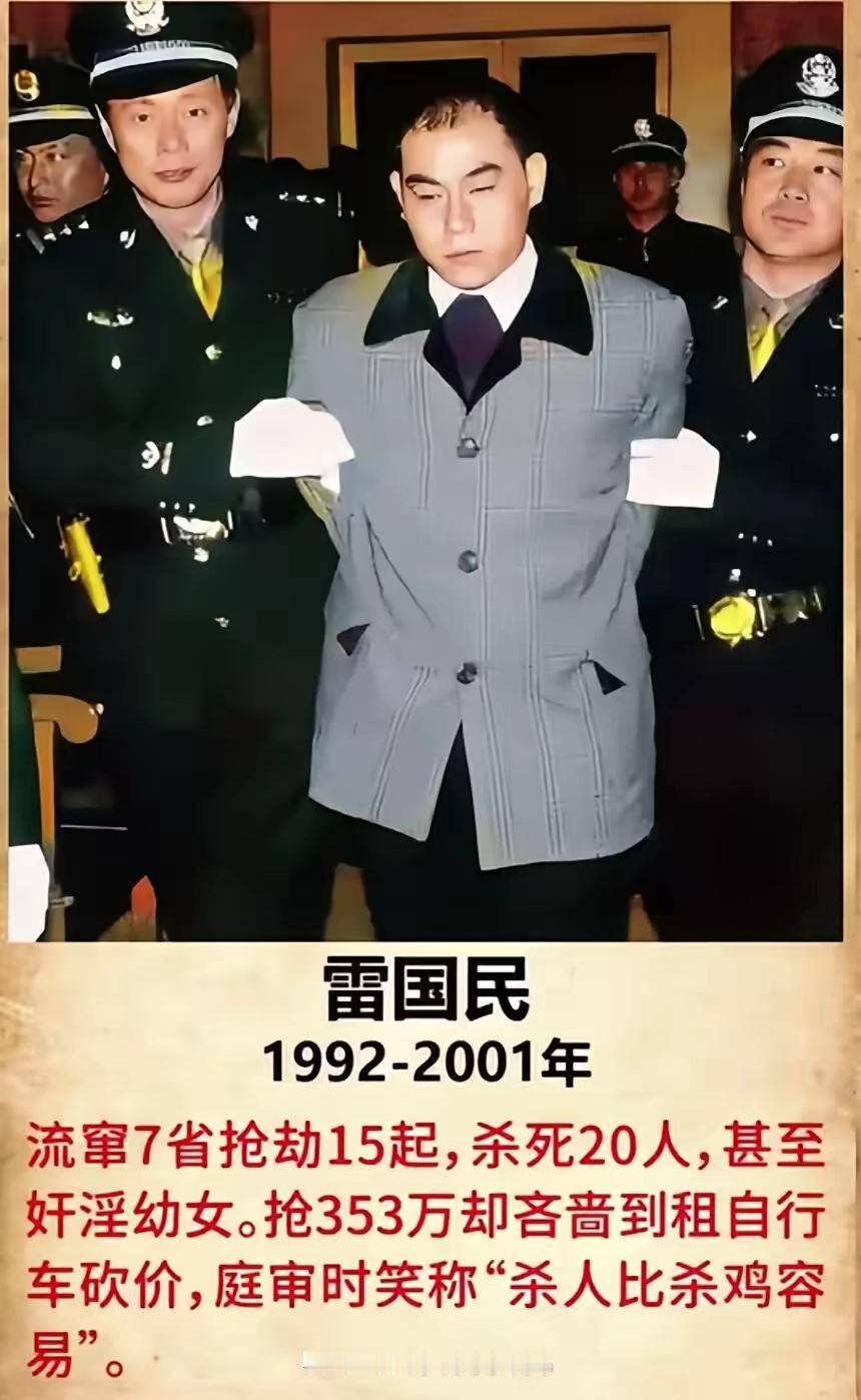 雷国民,这个名字曾让人闻风丧胆。1971年生于安徽桐城贫困农家,家庭环境让他早早走上歧途。1992年,21岁的他第一次杀人,此后在多地流窜作案。1992 - 2001年,他杀人抢劫12起,杀死23人,杀伤2人,抢劫财物价值400余万元。像2000年他在宿州信用社抢19万,2001年在盐城信用社劫走260万。2001年6月他在深圳被抓,8月案件侦破。最终他因抢劫罪、奸淫幼女罪被判处死刑,2001年12月被执行枪决。他的罪行令人发指,也给社会敲响了警钟。