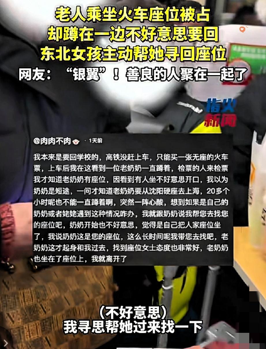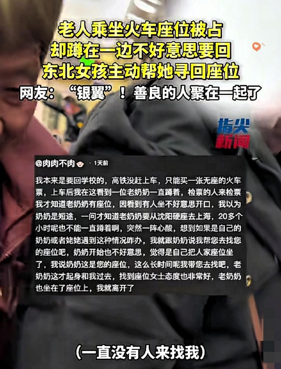 火车上撞见暖心一幕,善良真的会传染 火车过道里,一位老人明明买了座,却因为不好意思开口,只能蹲在角落。 女孩瞧见后主动上前,帮老人找到占座的女子说明情况,对方二话不说就让了座,还一个劲儿道歉。 原来女子也不是故意的,只是一直没人来坐,还以为座位空着呢。 这事儿看着小,却戳中了人心最软的地方。 老人的忠厚、女孩的热心、占座女子的爽快,少了哪一个都成不了这桩暖心事。 很多时候,不是世界不够好,而是需要有人先迈出那一步,打破人与人之间的那点拘谨。 要是你在火车上碰到这种事,会主动站出来帮忙吗?评论区说说呗!