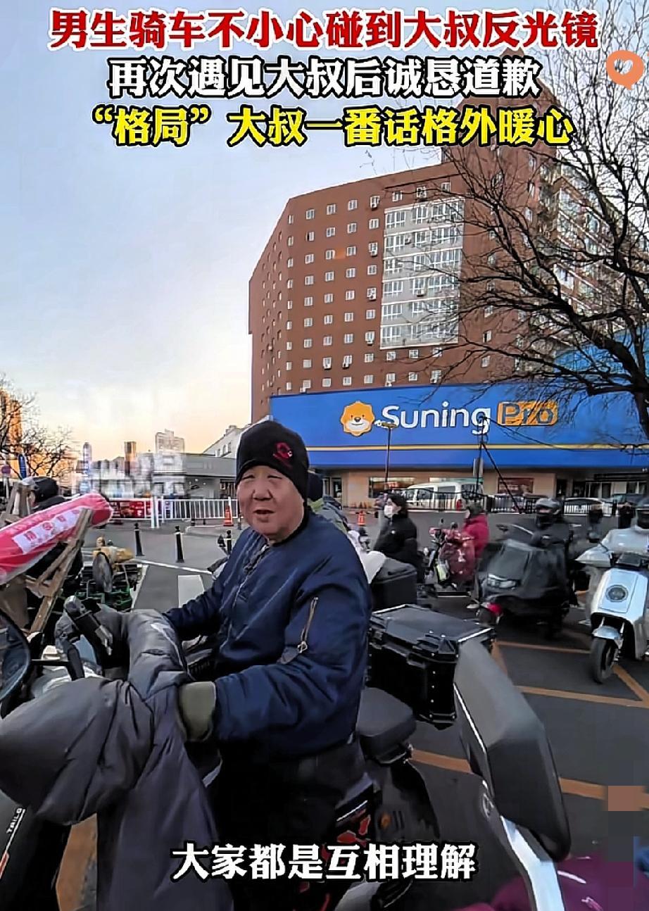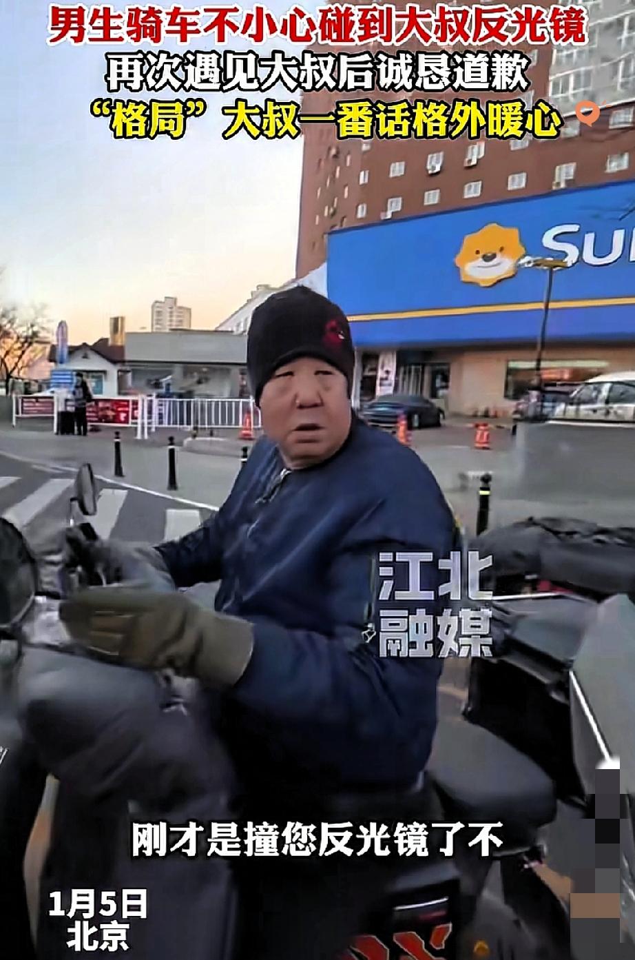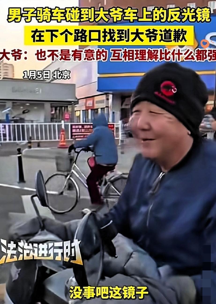 果然,好人就是好人,老了也是! 北京一小伙骑车刮歪大爷后视镜,心都揪紧了,生怕遇上难缠的主,结果大爷看都没多看,直接骑车走人。 换谁不得愣一下? 小伙子愣是追了一路,红灯口赶紧凑过去道歉,大爷一句话直接暖到人心窝里:“这点小事吵吵啥,耽误时间,互相理解比啥都强!” 你说这事儿值不值得夸? 现在路上丁点摩擦就剑拔弩张的太多了,大爷这格局,真不是装出来的。 更难得的是小伙子那份不逃避的担当,有错就认,追上道歉,这才叫双向的善意。 哪是什么“幸运碰到好人”,分明是两个通透的人,把一件糟心事变成了暖心事。 别总说现在人情淡薄,这样的普通人,这样的小温暖,才是咱们日子里最亮的光。 换作是你,刮到别人车会第一时间道歉吗?评论区聊聊呗!
