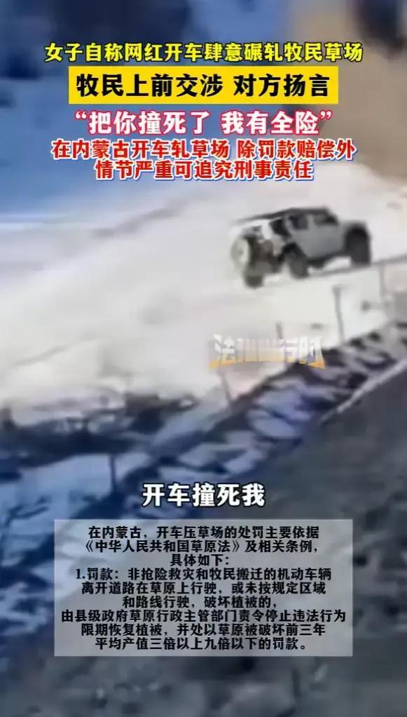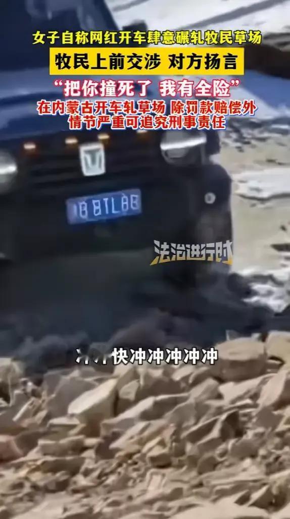 这就是所谓的网红吗? 不知所谓,霸道,拿别人的生命当儿戏! 开车碾压牧民草场,知错不改,还叫嚣“ 我撞死你,我有全险”。 你不是网红吗?怕你不够红再给你加加油!
