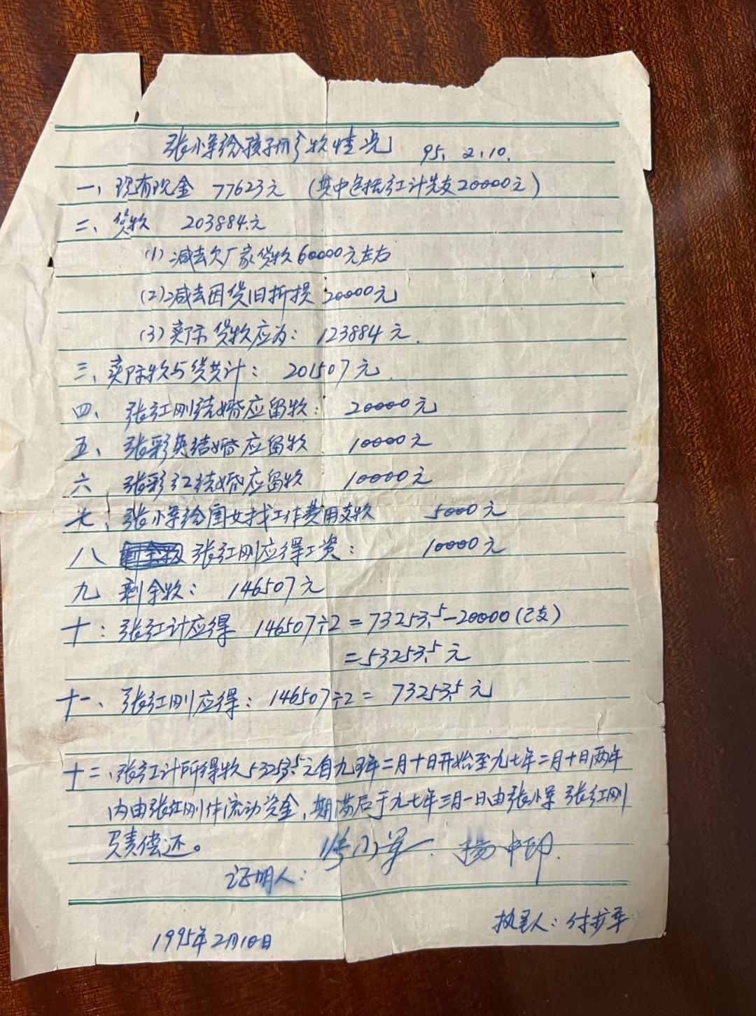 “分家”这个词你有多久没听过了,是不是那些年每家都有一本分家的账,这是30年前爷爷手写的分家账,虽然会吐槽他有着重男轻女的"偏心",但也佩服他把一个家拆解得如此细致周全。 收拾老屋时,我从家里斑驳的保险柜最底层,翻出了一张泛黄起皱的纸条。轻轻展开,是爷爷30年前手写的分家明细——1995年2月10日。 纸上的蓝色墨水已有些晕染,但一笔一划工工整整,像他严肃认真的性格。上面赫然列着那个年代堪称“巨款”的家庭总资产:现金77623元,货款203884元。我仿佛能看到爷爷戴着老花镜,在灯下拨弄算盘的身影。 令我惊叹的是这份清单的“专业”。他不仅列出了总数,还细致地扣除了“减厂家欠款”和“旧货折损”,金额甚至精确到了小数点后一位。这哪里是分家,简直是一份严谨的家庭财务审计报告。 然而,数字背后也藏着那个时代特有的印记。两个姑姑每人分得1万元“结婚应留款”,而爸爸和叔叔则各自分到了5万多和7万多。那一刻,我确实看到了纸上无声的重男轻女。 但继续往下看,又有暖流涌动。爷爷特意为给闺女“找工作”留了专款;爸爸因急需,提前支走了2万元“流动资金”;叔叔的钱则约定两年后偿还……这些如今陌生的名词,勾勒出一个父亲在清贫年代里,竭尽全力为每个子女铺路的良苦用心。 我也会吐槽他的“偏心”,但此刻,更多的却是佩服——佩服他在有限的条件下,用他独有的方式,把对这个家的责任与爱,拆解得如此细致、周全。 这张纸条,是一页沉重的家庭经济史,更是一份沉甸甸的、充满时代局限却无比真实的父爱。它让我读懂了一个沉默的父亲,所能给出的全部担当。 你们分家的时候都是怎么分的,真的是锅碗瓢盆都要分吗?兄弟分家的恩怨 兄弟两分家