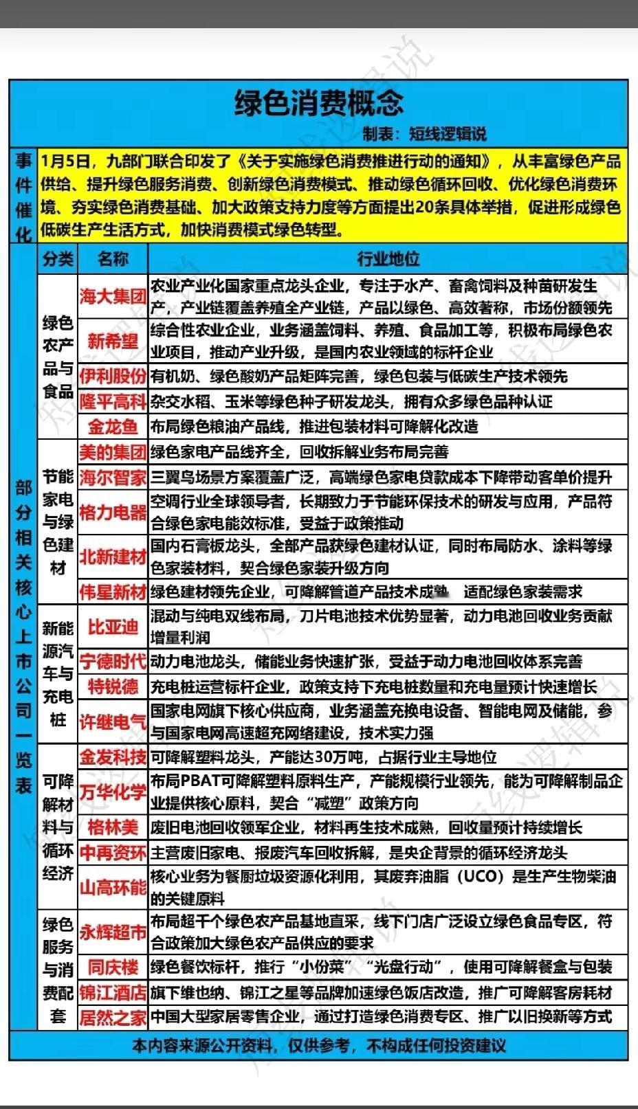 1月7人,周三A股这个板块有望大爆发!!! 多部门印发关于绿色消费通知,从丰富绿色产品供给、提升绿色服务消费、创新绿色消费模式、推动绿色循环回收等方面提出20条具体举措,重点关注:海大集团、新希望、宁德时代!!!