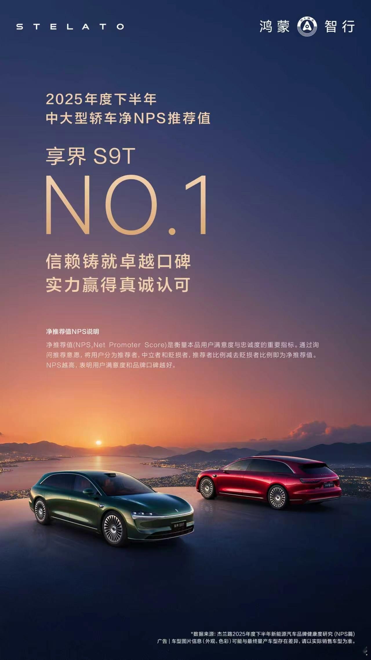 享界的产品力越来越强了,不仅销量起飞,而且口碑也越来越强。享界S9T获中大型轿车品牌净推荐值第一 近日,杰兰路2025年度下半年新能源汽车品牌健康度研究报告公布,鸿蒙智行首款旅行车享界S9T 荣获2025年度下半年中大型轿车净NPS推荐值第一,凭借旗舰9系的产品力及全面的用车场景,获得了消费者的青睐与认可。该报告也显示,享界品牌已跻身高档品牌阵营,得益于华为与北汽的双重背书,成为强信心品牌,消费者对其未来发展潜力认可度较高。据悉,享界轿旅双车在12月交付突破8800台,再创新高。