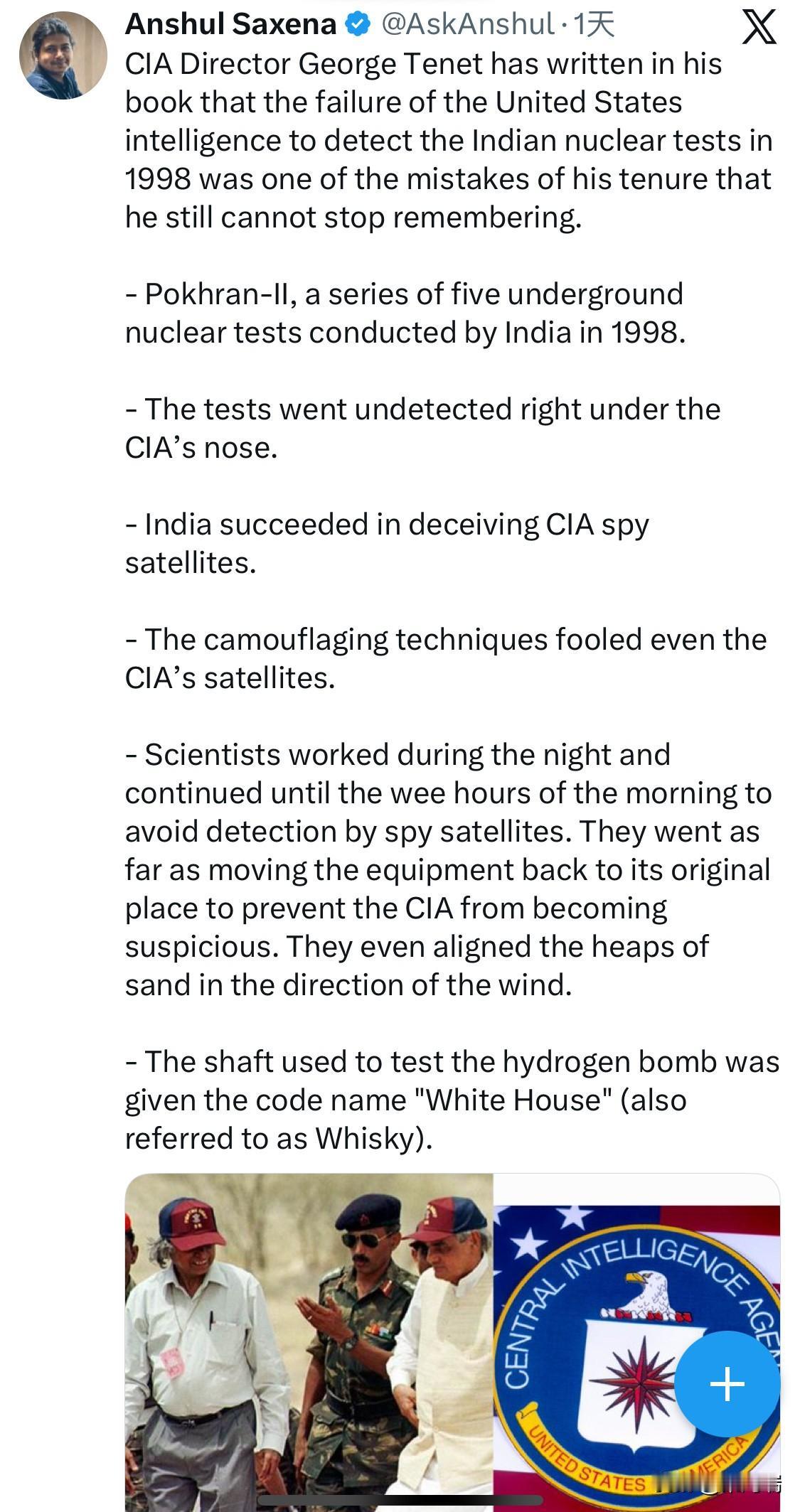 在1997-2004年担任中央情报局局长的乔治·约翰·特内特(George John Tenet)在他的书中写道,美国情报部门未能发现印度在 1998 年进行的核试验,是他任职期间犯下的错误之一,至今他仍无法释怀。 - 博克兰-II,印度于 1998 年进行的五次地下核试验。 这些测试竟然在中央情报局眼皮底下进行,完全没有被发现。 印度成功欺骗了美国中央情报局的间谍卫星。 这些伪装技术甚至骗过了中央情报局的卫星。 为了避免被间谍卫星探测到,科学家们通宵工作,一直持续到凌晨。他们甚至将设备搬回原位,以防止中央情报局起疑。他们还特意调整了沙堆的方向,使其与风向一致。 用于测试氢弹的竖井被赋予了“白宫”(也称为威士忌)的代号。