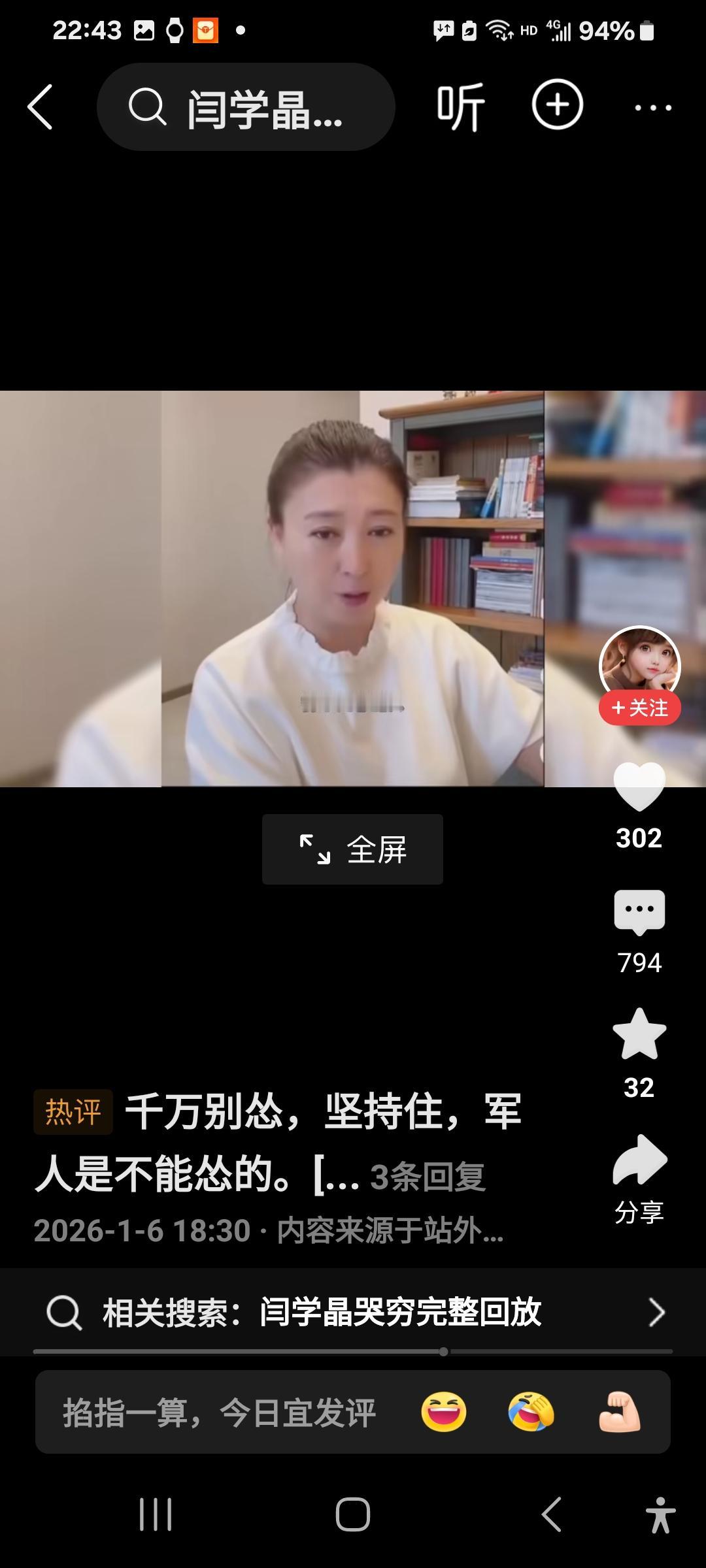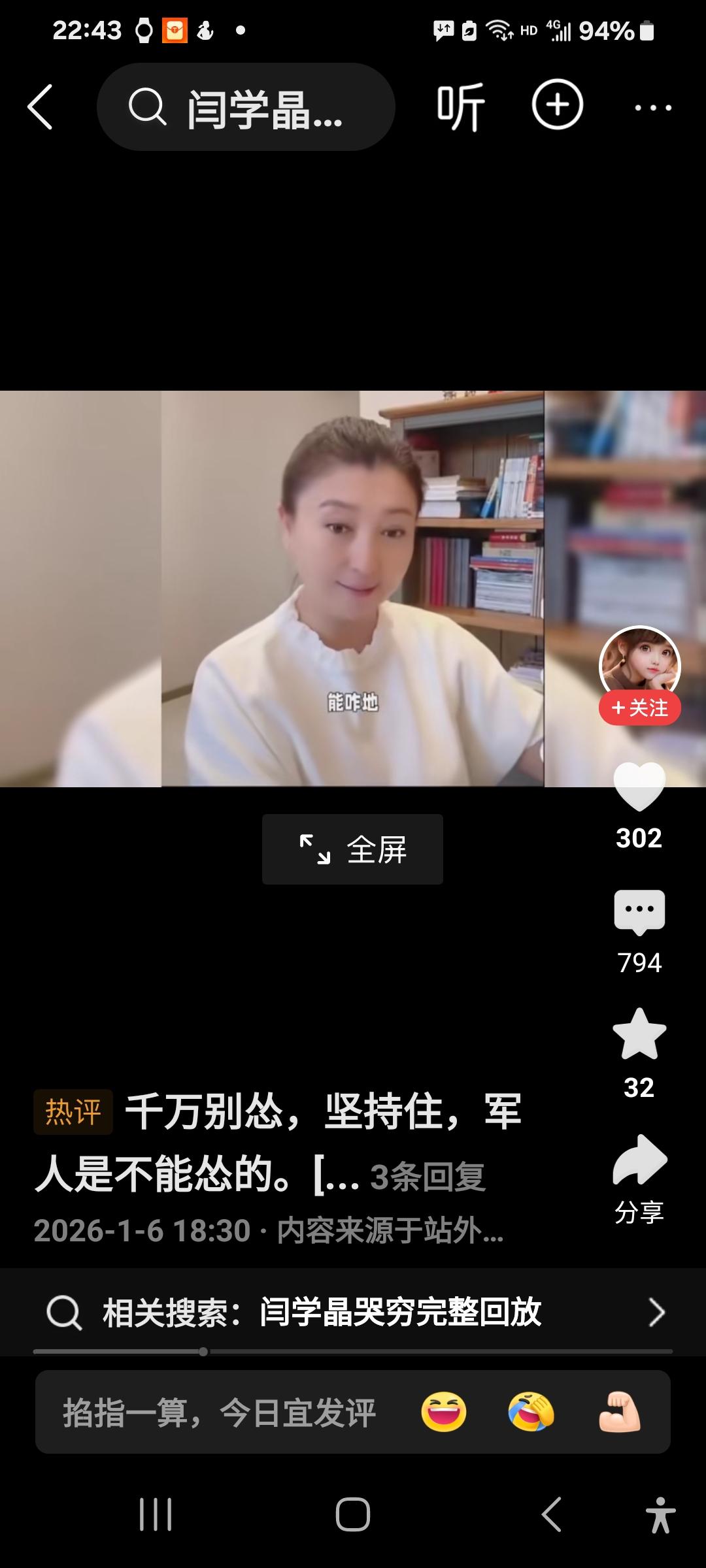 临睡之际,刷到了闫学晶老师这个视频,她一连说了三个“能咋地”,对不满她的人不屑一顾。 闫学晶老师还说,坚持能咋地,不坚持又能咋地,自己要坚持下去,不坚持下去,就是怂,自己不是怂的人,爱咋地就咋地。 有网友评论道,希望闫老师一定要坚持到底别认怂,大不了少吃几顿海参,少喝几碗燕窝罢了。挺住,人民艺术家!