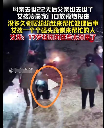 母亲去世22天后,父亲今天凌晨也离世!女孩趴在父亲身上失声痛哭!最后用袖子擦干眼泪把母亲去世时剩下的鞭炮,拿到门口去放炮报丧!没过多久,邻居纷纷赶来帮忙处理后事! 女孩跑过去一个一个的跪谢来帮忙的人!家里一贫如洗,一个女孩子根本无力置办父亲的丧事!女孩懂事得让人心疼!未来的路只能靠自己走! 17岁的年纪就要承受这么沉重的现实!生老病死是自然法则,谁都有离去的那一天!但是如果发生在自己身上,却没有一个人能够释怀! 未来无论贫穷,还是富有,健康还是疾病,只能自己一个人承受!17岁的年纪,如果不读书,过两年应该也就结婚生子了!这也许就是穷苦人家女孩的宿命吧!