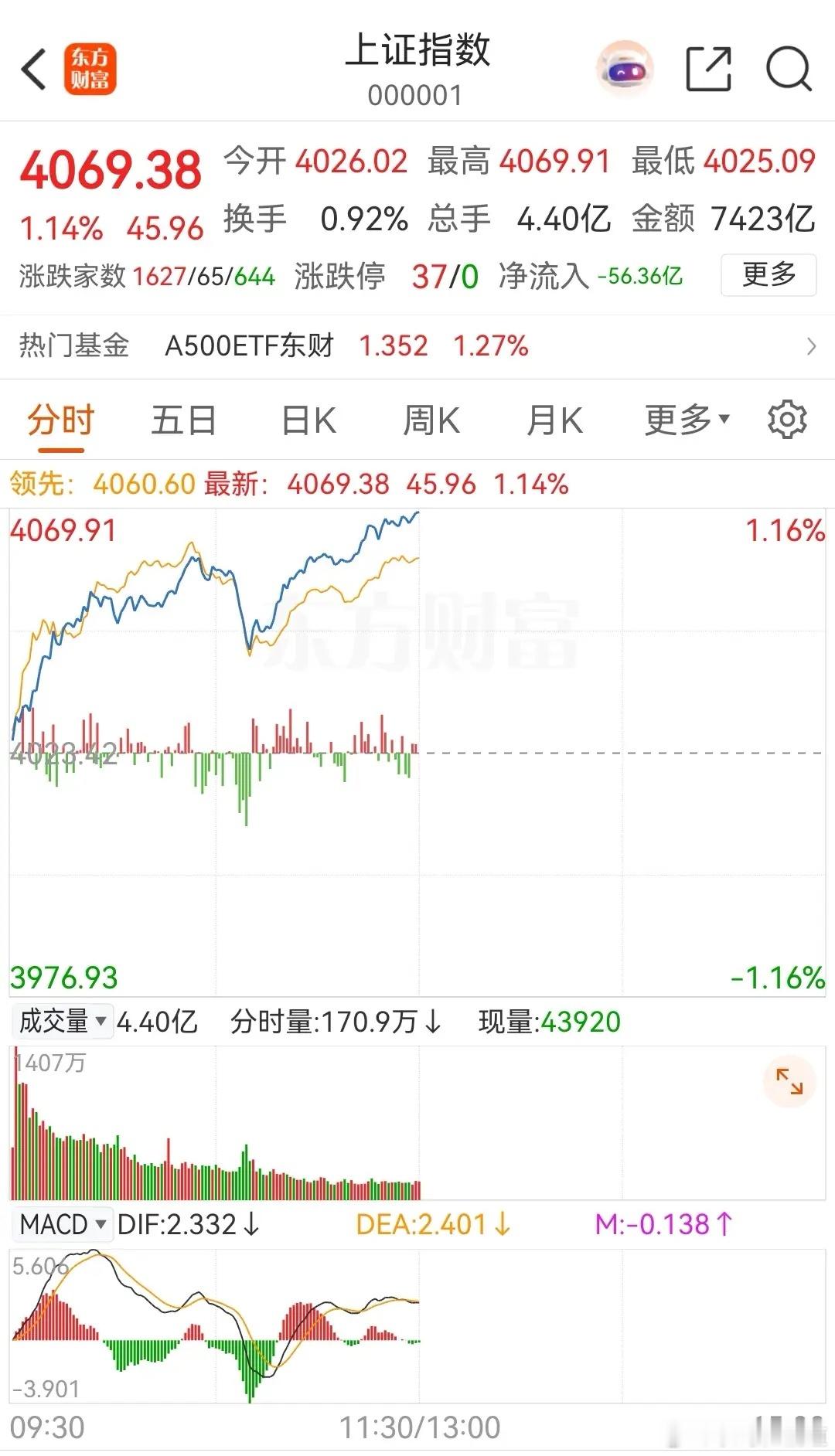 券商概念板块低开高走,带领大盘刷新近10年历史新高。今天上午大盘高开高走,虽然10点半时有跳水,但只是正常的盘中洗盘而已,随后再次被拉起,继续上涨,最终收报在最高点4069。午间收盘时,两市上涨个股有3696家,下跌个股有1590家, 107只股涨停;两市半日合计成交1.7813万亿元,相比昨日同期放量1455亿元,预计今天的总成交量将达到2.7万亿。今天上午券商概念板块终于动手了,午间收盘时大涨3.1%,板块内有华林证券和华安证券两只个股涨停,指南针和同花顺大涨超7.0%。随着上午收出的这根大阳线,已完全收复了各条均线,技术面上彻底走牛。在资金流向上,上午半天主力资金净买入了57.14亿元。对于下午的走势,大盘指数还会再次刷新近10年历史记录。上午盘中说过今天的压力位在4057点,从上午的盘面上看已经突破,且回踩确认成功,那么今天下午的市场没什么大的问题,接下来还将会继续向目标位4112点附近靠近。