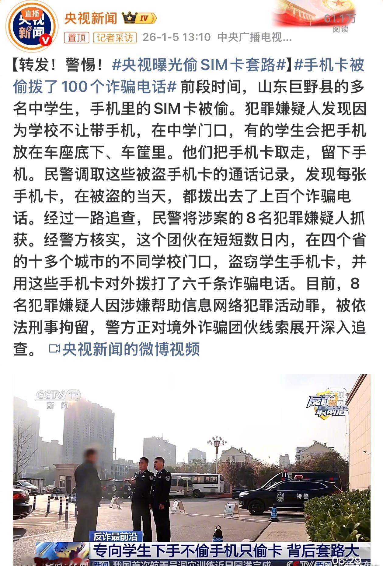 犯罪团伙瞄准学校禁止带手机的规定,专挑学生藏匿在校外电动车座底、车筐中的手机下手 划重点,不偷手机,仅盗取手机里的SIM卡,然后用SIM卡进行诈骗。 因为被偷的都是学生,发现手机还在,只是被偷SIM卡,因此大多数学生往往不会声张,也不敢告诉家长