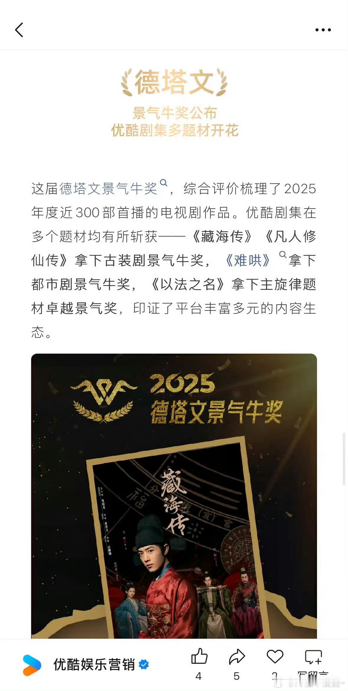 太棒了!让我们恭喜肖战的《藏海传》又断层第一啦!《藏海传》是真的做到了各个平台的年冠!各官方就是这么夸夸这个《藏海传》不加任何无限定词的剧王!!!肖战藏海断层第一