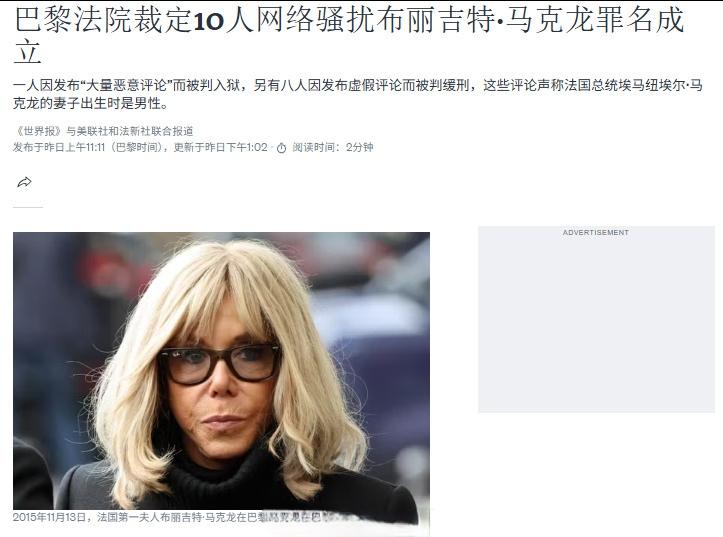 巴黎法院判处10名在网上攻击马克龙夫人的法国网民“网络骚扰罪”成立,8人缓刑、1人强制进行文明上网教育,还有发帖最多的1人被判处6个月监禁。