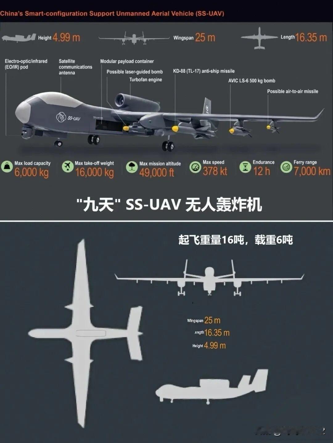 “九天”无人机航母:把科幻“空中母机”飞进现实 “九天”是中国自主研发的全球首款大型无人蜂群载机平台,由航空工业集团打造,2025年12月完成首飞,核心定位是“空中无人机航母+多任务作战枢纽”,真正实现了“母机携蜂群”的科幻作战场景,标志着中国无人机技术进入体系化作战新纪元。 核心参数(官方公开数据) - 平台体量:机长16.35米、翼展25米,最大起飞重量16吨,载荷能力达6吨,堪比中型战斗机的承载量,是美国MQ-9“死神”无人机载重的3倍多 。 - 飞行性能:搭载国产“秦岭”涡扇发动机,最大速度700公里/小时,升限1.5万米(可避开多数中程防空系统),续航12小时、转场航程7000公里,作战半径覆盖亚太核心区域 。 - 蜂群搭载:机腹集成“异构蜂巢任务舱”,可装载200-300架微型无人机或36枚巡飞弹,90秒内就能完成全部释放,形成覆盖15平方公里的饱和打击蜂群。 - 挂载能力:机翼设8个重型外挂点,可挂载鹰击-12反舰导弹、长剑巡航导弹、电子战吊舱等,既能当“蜂群母舰”,也能化身“无人炸弹卡车”。 核心黑科技:从设计到实战的颠覆 1. 异构蜂群作战系统:蜂群包含侦察、攻击、电子干扰三类无人机,通过AI自主协同——侦察机锁定目标、干扰机瘫痪通信、攻击机精准打击,让敌方防空系统顾此失彼,拦截成功率从98%骤降至37%。 2. 模块化快速切换:采用“通用平台+可换任务舱”设计,2小时内就能完成角色转换,可在蜂群母舰、电子战平台、战略轰炸机、应急物流机等多种形态间切换,军民两用场景全覆盖 。 3. 超视距指挥链路:作为空中通信中继站,解决微型无人机航程短、通信弱的痛点,通过“人在回路+AI自主决策”模式,实现对纵深目标的远程操控与精准打击 。 4. 强生存能力设计:联翼布局提升长航稳定性,可在山区、海岛等复杂地形短距起降;配备主动光学干扰装置和电子战吊舱,能压制敌方雷达、反制红外制导导弹 。 实战价值:重塑未来战争模式 - 饱和打击优势:10架“九天”可释放3000架无人机,形成“蜂群海”,足以瘫痪航母战斗群或区域防空体系,是不对称作战的“终极利器”。 - 防区外作战安全:7000公里航程支持远距离投送,母机无需进入敌方防空圈,就能释放蜂群打击纵深目标,大幅降低作战风险 。 - 多场景适配:军事上可覆盖台海、南海等热点区域,执行反舰、对地、制空任务;民用领域能承担重型物资运输、应急救援投送、地理测绘等任务,实现“一机多用” 。 科幻与现实的跨越:为何是全球首创? - 此前各国蜂群多依赖地面发射,航程受限;“九天”将发射平台搬至高空,彻底突破了蜂群作战的半径瓶颈 。 - 美军曾提出类似“地狱景观”概念,但未实现工程化;“九天”已完成首飞并公开亮相,成为全球首款落地的大型无人蜂群母机。 - 命名源自《孙子兵法》“善攻者,动之于九天”,恰如其分体现了其“从天而降、不可阻挡”的战略威慑力。