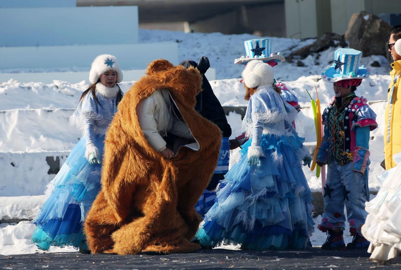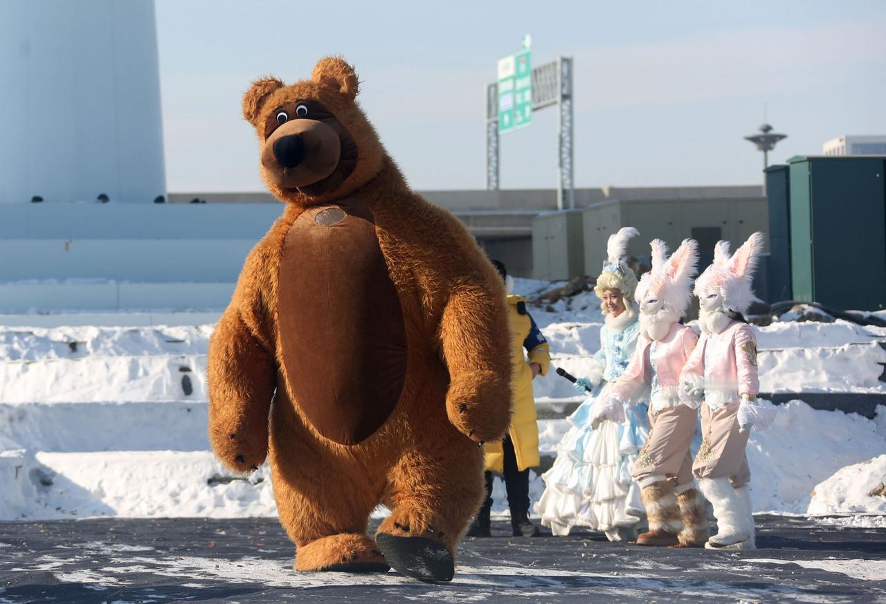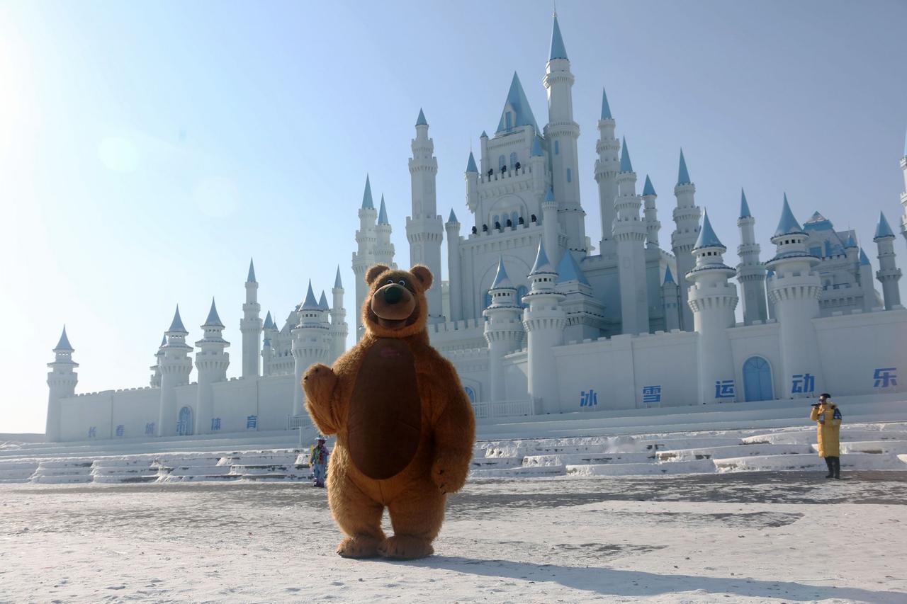 长春肆季南河冰雪乐园舞台上憨态可掬的大熊人偶