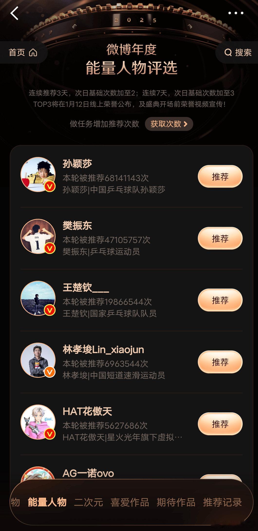 微博年度能量人物年度能量人物前三分别是:孙颖莎、樊振东、王楚钦恭喜国乒包揽前三