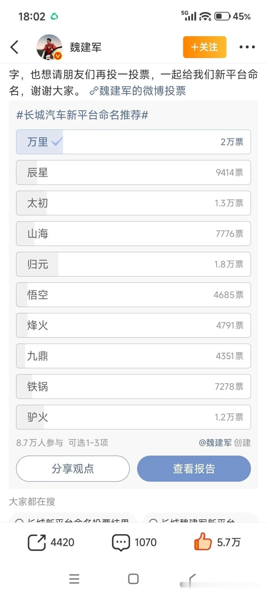 魏建军宣布新平台命名归元 驴火败北,归元胜出,万里虽然票数高,但是长城法务提醒不建议用(长城万里,万里长城都申请不下来)归元,符合第一性原理(为人服务),也意为回归初心、抓住根本,不玩虚的,专注安全、可靠和省钱。