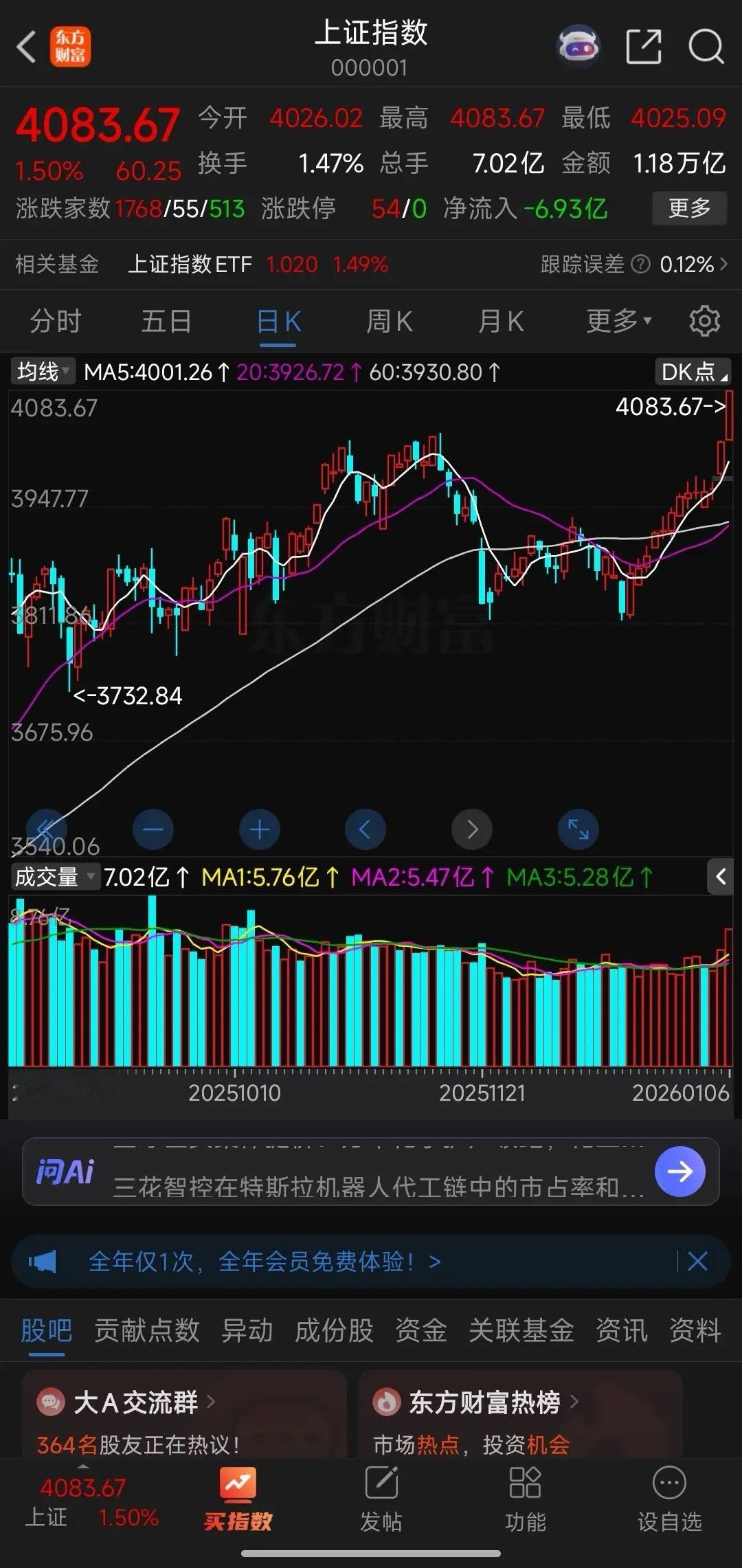 上证指数十三连阳后明日(1月7日)走势预测 核心结论:明日大概率呈现高位震荡整固,早盘冲高4100点附近遇阻后回落,午后企稳回升;收小阳/小阴/十字星概率约70%,继续收大阳概率约20%,深调概率仅10%。短期趋势仍偏强,调整多以日内震荡完成,不破5日线(约4060元)则趋势不改 。 一、关键数据与背景 - 今日收盘:4083.67点,涨幅1.50%,成交额1.18万亿,两市总成交2.81万亿,创13连阳历史纪录 - 技术状态:日线多头排列,短期指标(KDJ、RSI)超买;周线趋势向上,中期支撑稳固 - 资金面:北向资金持续净流入,杠杆资金活跃,增量资金入场意愿强烈 二、支撑位与压力位短期 4060元(5日线) 今日收盘价-23点,短期趋势生命线4100元(整数关口) 心理关口+技术阻力区 中期 4050元(成交密集区) 前期平台+今日跳空缺口下沿 4120元(前高延伸位) 技术形态目标位 强支撑 4020元(20日线) 中期趋势支撑,破位则调整加深 4150元(长期上升通道上轨) 长期技术压制位 三、三种可能走势推演 1. 震荡上行(概率约40%)- 路径:小幅高开(4090-4100点)→ 短暂回踩4070→4060→ 午后放量上攻→ 收盘4100-4120点,收小阳- 触发条件:证券板块继续领涨,北向资金净流入超80亿,量能维持2.5万亿以上 - 操作:持股为主,冲高至4120附近减仓15%-20%2. 冲高回落(概率约50%)- 路径:高开至4100点附近→ 获利盘抛压导致快速回落→ 回踩4050-4060支撑→ 午后企稳→ 收盘4070-4090点,收十字星/小阴- 触发条件:权重板块分化,量能萎缩至2.2万亿以下,技术超买引发获利回吐- 操作:早盘冲高减仓20%-30%,回踩4050附近企稳后接回3. 深幅调整(概率约10%)- 路径:高开低走→ 跌破4060→ 下探4020-4030→ 收盘4030以下,收中阴- 触发条件:突发利空、权重集体砸盘、量能急剧萎缩- 操作:跌破4060立即减仓50%,破4020清仓观望 四、操作建议(对应走势) 1. 持股策略:- 持有核心资产(券商、科技、周期龙头),以5日线(4060元)为生命线,不破则继续持有 - 每涨50点减仓10%,控制仓位在50%-70%2. 低吸策略:- 回踩至4050-4060区间,且缩量企稳时,加仓15%-20%- 若回踩4020-4030区间,且出现止跌信号(阳包阴/锤子线),可重仓低吸3. 风控策略:- 单笔仓位不超过30%,总仓位不超过70%- 严格止损:跌破4060减仓,跌破4020清仓离场 五、关键观察点 1. 量能:维持2.5万亿以上则强势延续;降至2.2万亿以下则调整概率大增 2. 板块轮动:证券板块能否持续领涨,科技、周期是否接力;若权重集体熄火则警惕回调3. 北向资金:净流入超50亿为积极信号;净流出则需谨慎。 以上分析仅供参考,不做任何操作建议。