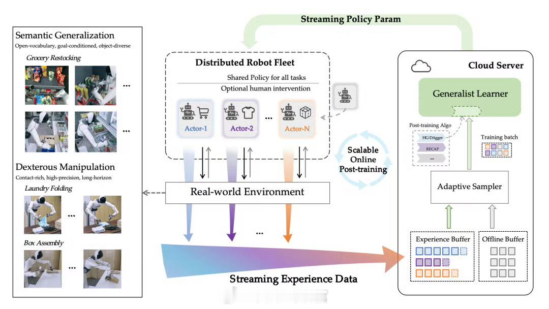 智元具身研究中心提出 SOP(Scalable Online Post-training)—— 一套面向真实世界部署的在线后训练系统。官方称,这是业界首次在物理世界的 VLA 后训练中,系统性地融合在线学习、分布式架构与多任务通才性,使机器人集群能够在真实环境中持续进化,让个体经验在群体中高效复用,从而将“规模”转化为“智能”。具身智能308_IO人形机器人