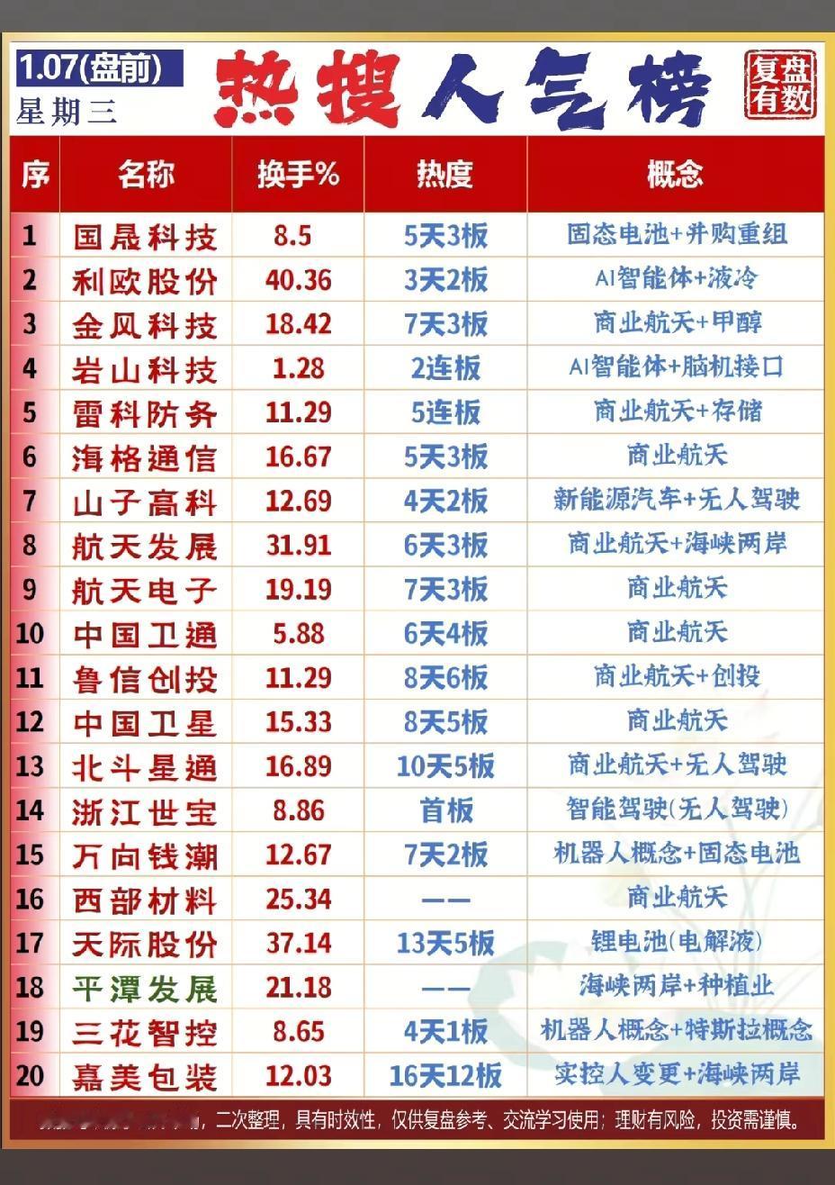 1月7号,周三A股盘前热门人气股!!! 国晟科技5天三板,固态电池叠加并购重组概念,今日停牌核查;利欧股份3天2板,AI智能体叠加液冷概念,后市值得重点关注;金风科技7天3板,大柚子轮番上阵,后市值得高看一眼!!!