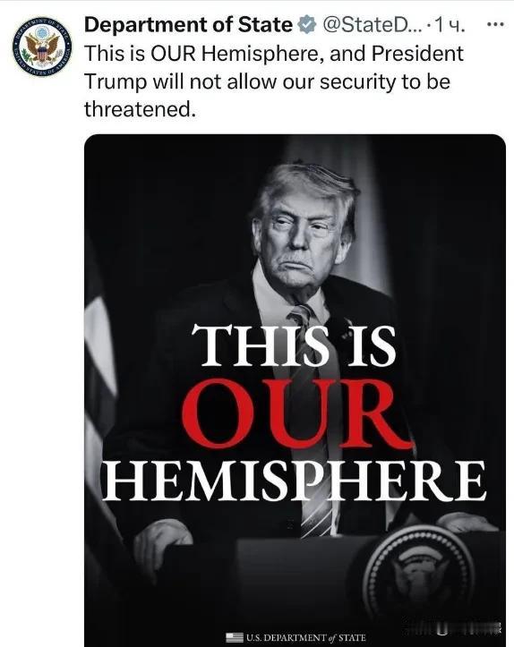 美国大使馆官方账号上写的这些英文,翻译过来的意思,大概应该是这个意思:“这是我们的西半球,特朗普绝不允许任何势力对我们构成威胁。”它们的意思非常明确,西半球是美国的西半球,说白了,西半球就是要由美国说了算,美国想怎么干就怎么干,想怎么办就怎么办,威胁别人不要管,如果别人管的话,老特是会生气的,后果是很严重的,现在美国人的意思很明确,就是要将西半球列为本国的特殊利益区。