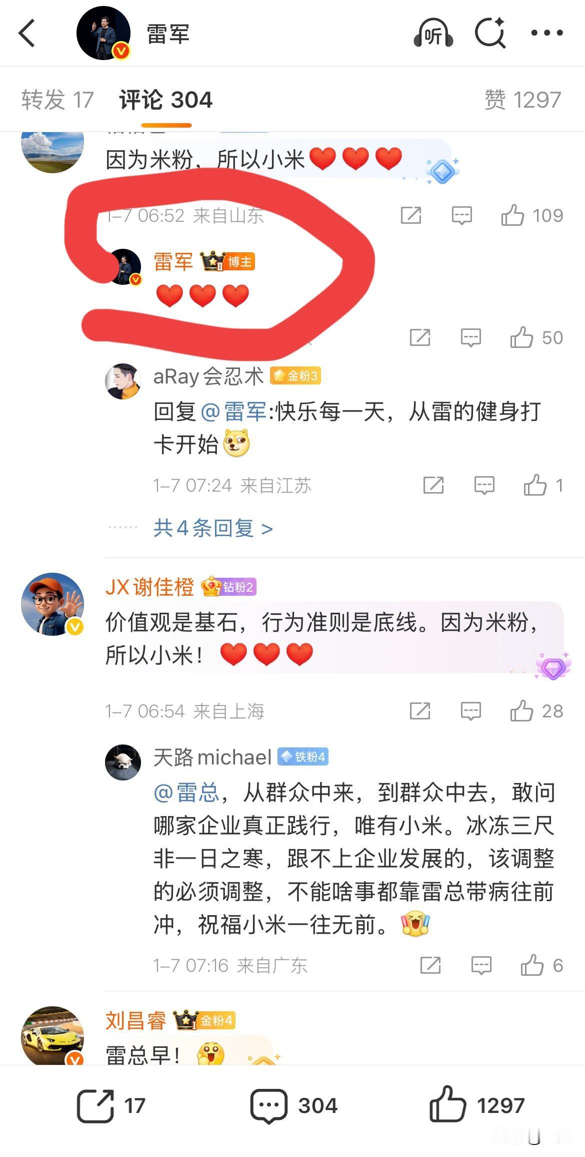 今天早上,雷军给这句话比了三个心! 今天一大早,雷军就开始了他的2026年健身打卡计划,昨天晚上他们临时处理了一批人,其中包括小米的一部分高管。 所以今天早上很多人想看看雷军是什么反应,其中留言点赞第一条的,就是八个字:因为米粉,所以小米。 雷军给这八个字连续了三个小心心,也就是说在某种程度上,雷军是认可这句话的,在他心里面,喜欢的人才是第一的人,与之相反的是,不管任何人,只要做了一些违背这八个字的人,那么可能会受到相应的处罚。 而且这些人是不分挣多少钱,在哪个位置的,所以这一次他们直接处罚到了自己的高管,说明雷军是比较相信这八个字的。 只不过接下来可能会存在一个具体的现实问题,那就是拥有好几万员工的小米公司,怎么能够管理好这些大大小小的事情,如果因为一个人的操作,导致了一串人受处罚,这种企业文化,与大公司发展的前景是否相吻合害值得商榷。 所以这操作到底是做给大家看的,还是从此以后就真的看到一起处理,还得由时间来说明。