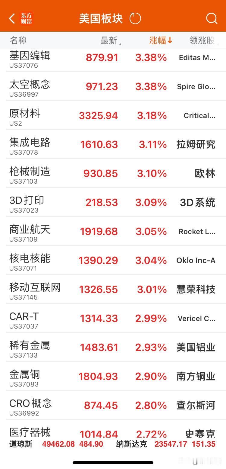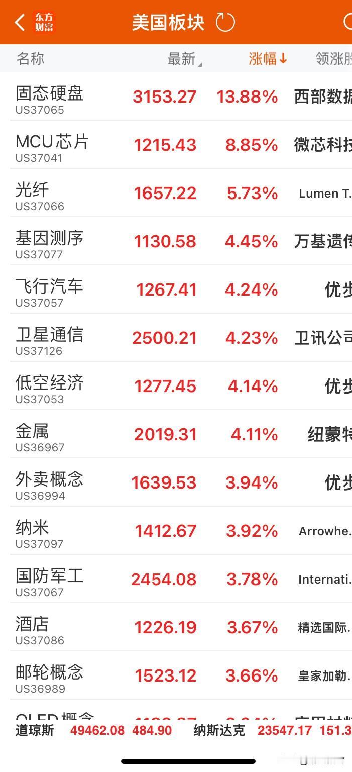 美三指数冲高回落收小阳 美股三大指数普涨,道指涨0.99%报49462.08点,纳指涨0.65%,标普500涨0.62%;中概股微跌0.58%。板块端固态硬盘、MCU芯片领涨,商业航天概念涨幅3.05%,位列涨幅榜中游,与太空概念、核电核能等硬科技赛道同步走高,科技及高端制造板块成市场主线。 沪指单边上涨阶段,回调大胆加仓,商业航天主线继续!