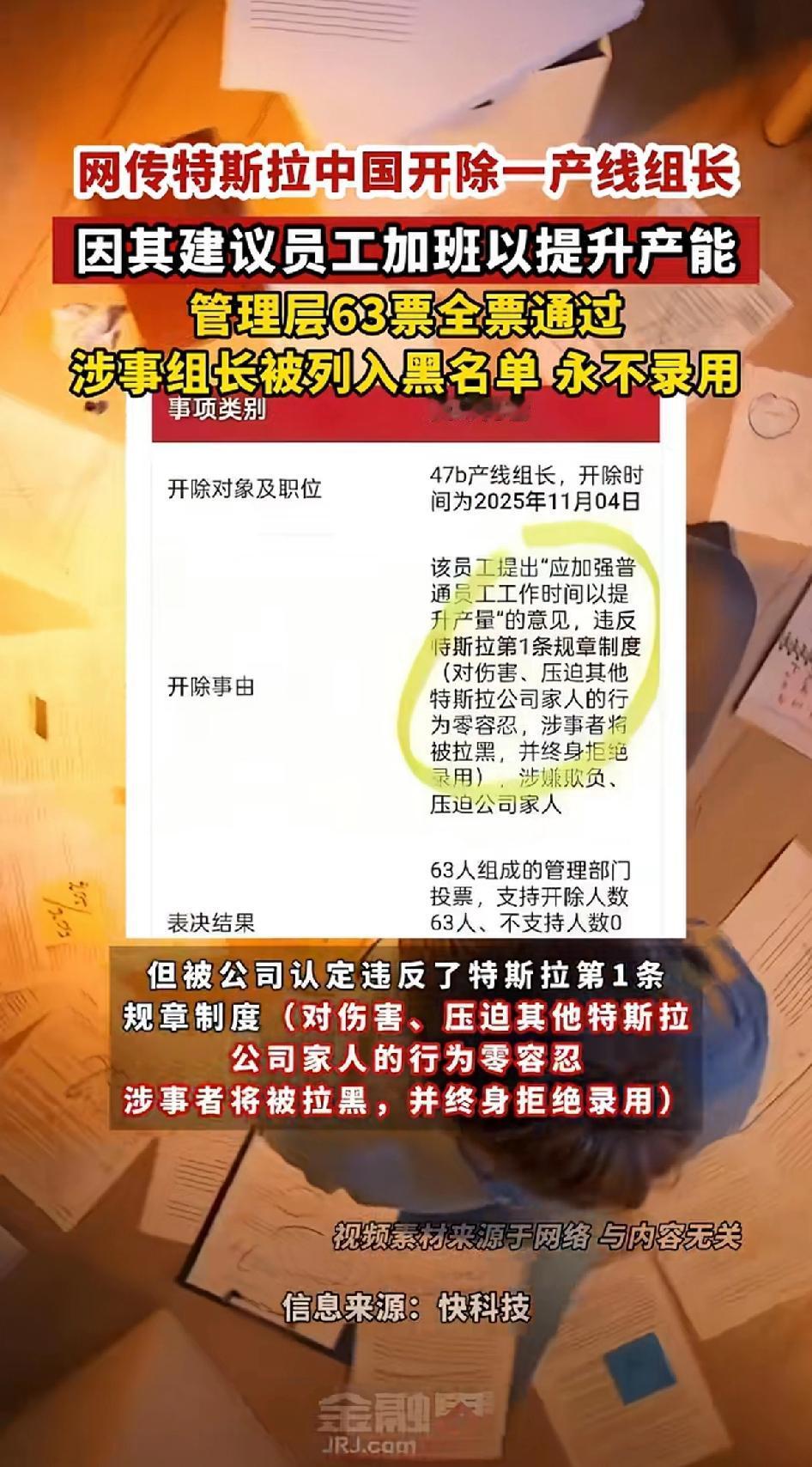 网传特斯拉中国开除一产线组长,这组长为提升产能提议员工延长工作时间,结果隔天就被开,63人管理团队全票通过,还终身拒绝录用。理由是违反公司规定,零容忍伤害、压迫同事行为。 事件发生于2025年11月4日,当时正值特拉斯上海超级工厂订单高峰期,这名47号产线组长提出延长工时的提议,但被公司认定违反特斯拉第1条违章制度。( 对伤害、压迫特斯拉公司家人的行为零容忍,涉事者将被拉黑,并终身拒绝录取)。 看来入职外企确实有好处,这组长打算实行国内的一套,结果聪明反被聪明误。仔细想这个组长还想让全公司加班,开除他的投票全部通过,0人反对。这是惹了众怒,开除也不亏呀! 这事儿在网上炸开了锅。有人吐槽,放国内某些车企,这组长说不定还能得奖。 像之前媒体曝光部分国内车企,员工月加班时长能到200小时,某车企还强制“896”,加班超20小时却只有10块餐补。 这对比太强烈,难怪被加班折磨的打工人都支持特斯拉,这组长邀功不成闹笑话,也只能另谋出路咯。